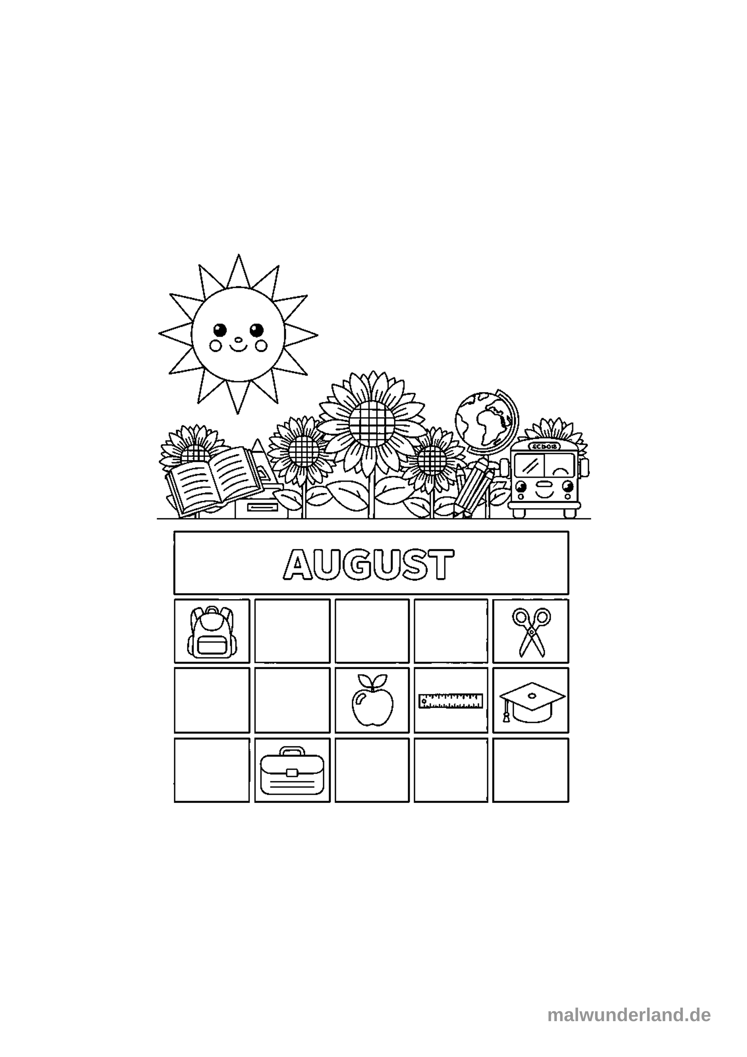 Ein Ausmalbild zeigt ein Kalenderblatt für den Monat August, umrahmt von Elementen des Sommers und des Schulanfangs. Über dem Kalender sind eine lachende Sonne, Sonnenblumen, ein offenes Buch, ein Globus, ein Bleistift und ein freundlicher Schulbus dargestellt.