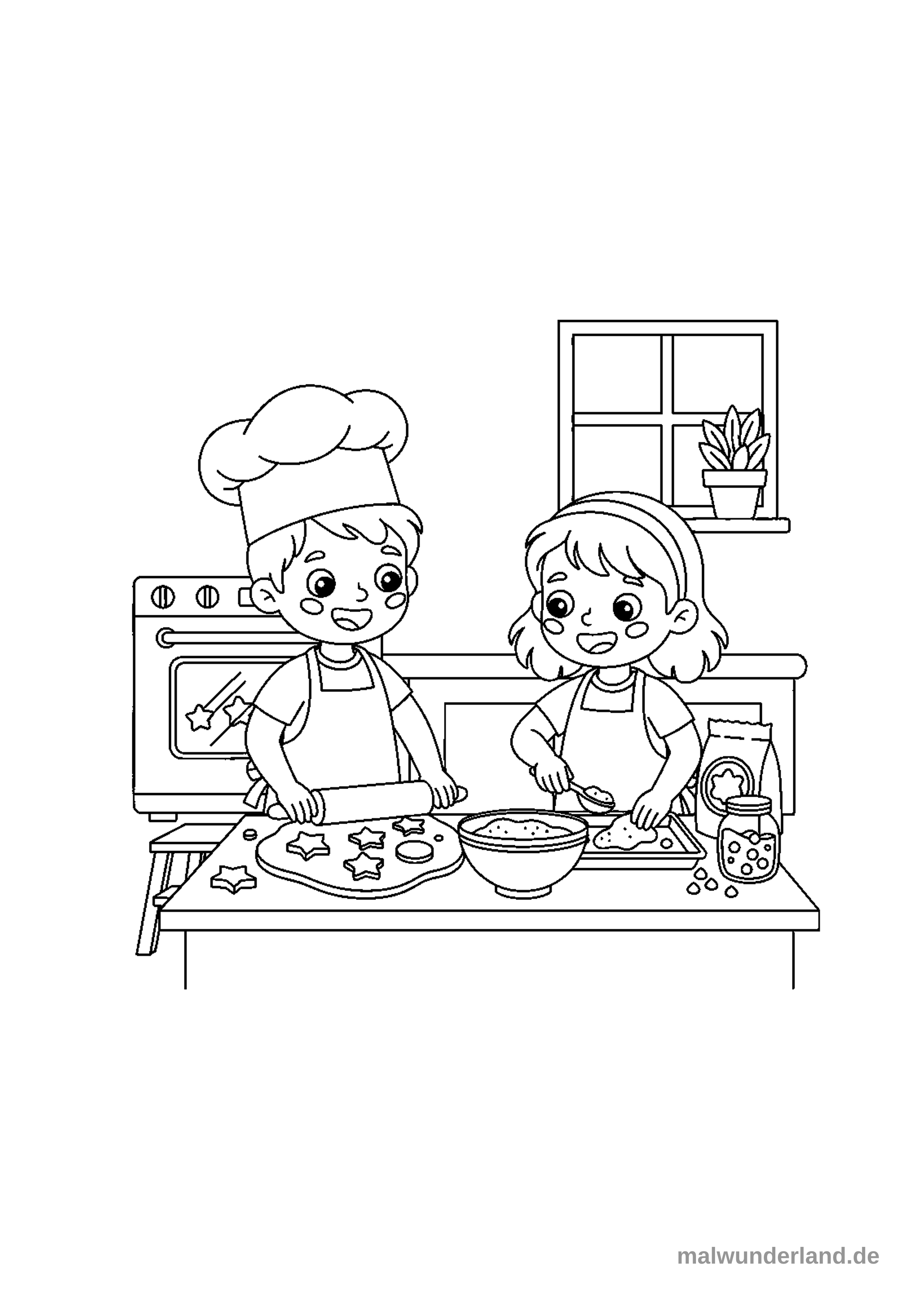Male die Kochmütze des Jungen weiß und seine Schürze in einem leuchtenden Blau. Das Haar des Mädchens könnte ein warmes Braun sein und ihr Stirnband ein fröhliches Pink. Der Teig auf dem Tisch ist hellgelb oder beige, und die fertigen Plätzchen im Ofen könnten ein knuspriges Goldbraun haben. Den Blumentopf auf dem Fensterbrett kannst du erdbraun malen, mit grünen Blättern.