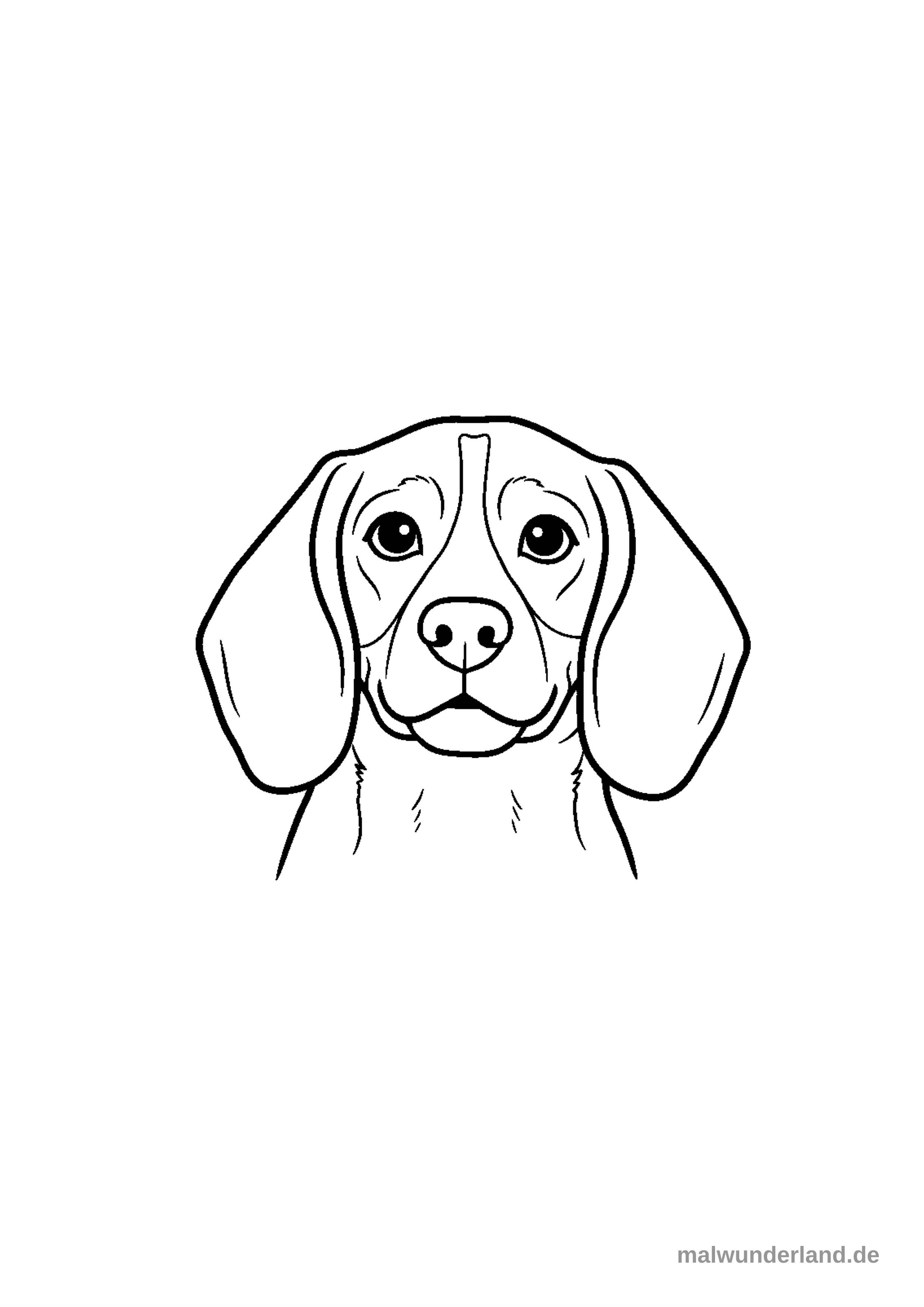 Das Bild zeigt die Schwarz-Weiß-Umrisszeichnung eines Beagle-Hundekopfes und des oberen Brustbereichs. Der Hund blickt frontal mit offenen Augen nach vorne und hat lange, hängende Ohren.