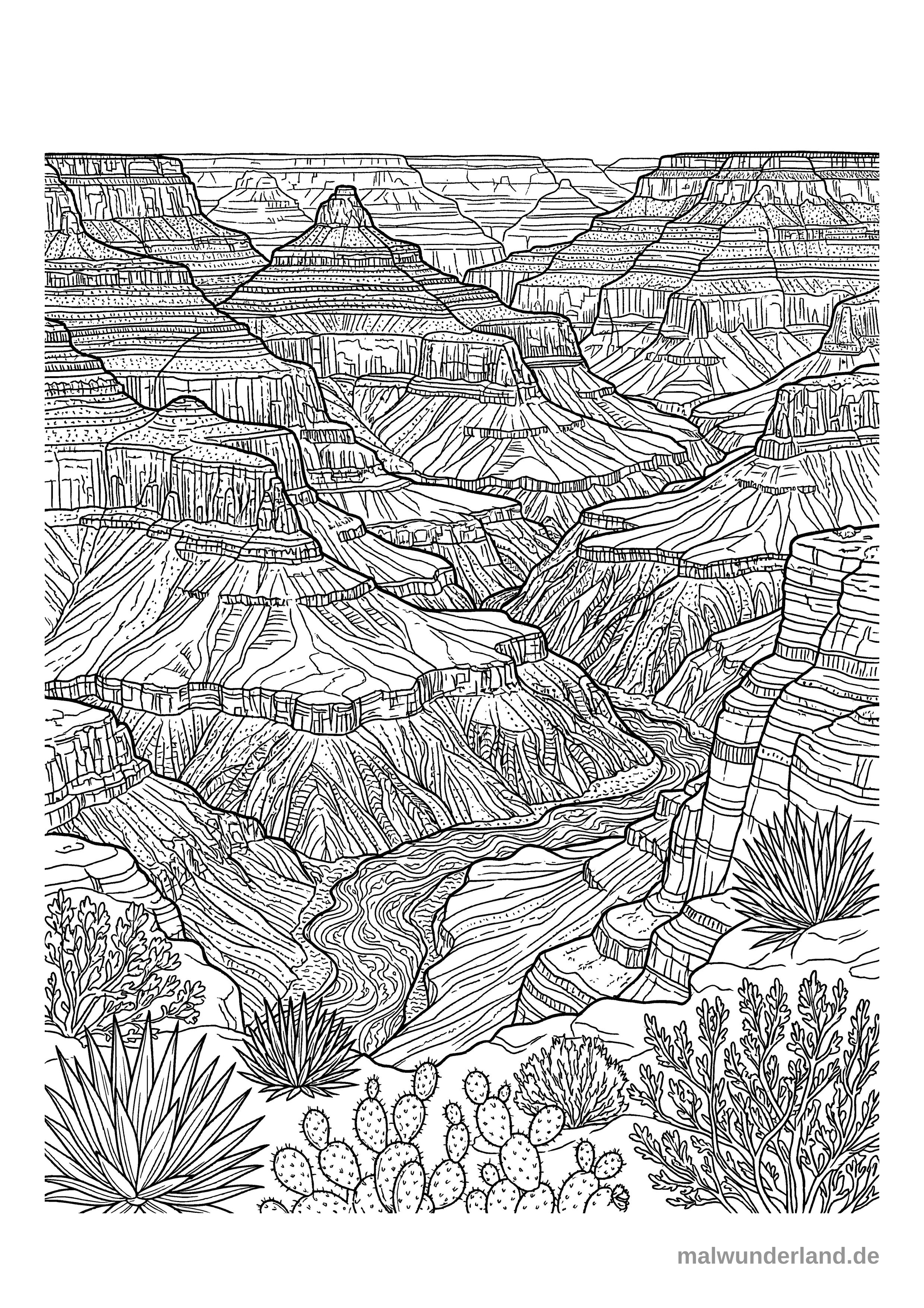Das Bild zeigt eine detaillierte Ausmalvorlage eines tiefen Canyons mit zahlreichen geschichteten Felsformationen und einem gewundenen Flusslauf am Grund. Im Vordergrund sind verschiedene Wüstenpflanzen wie Kakteen, Agaven und Sträucher zu sehen.
