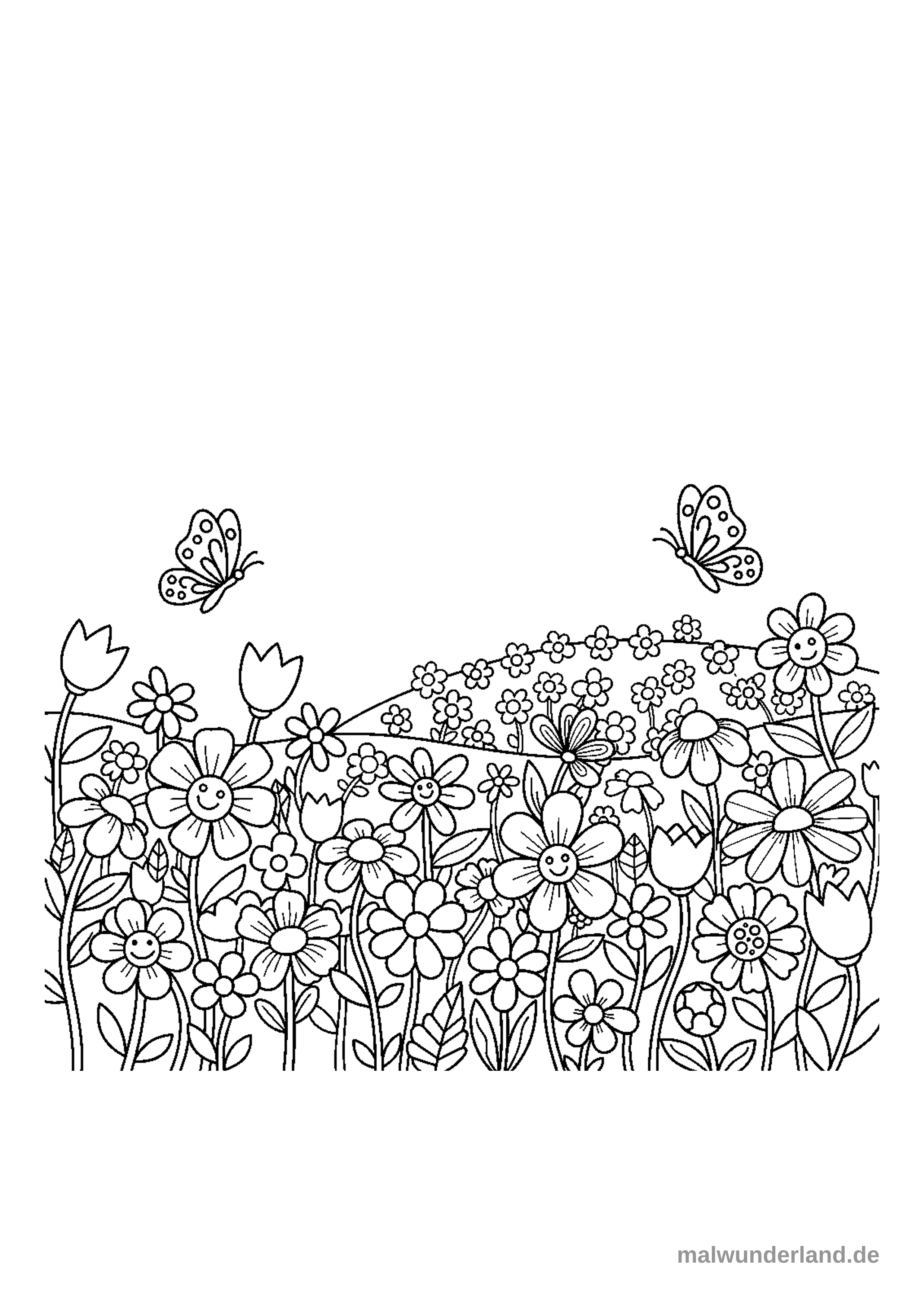 Male die großen Blumen mit den lächelnden Gesichtern in leuchtendem Gelb oder Hellblau. Ihre Mitte könnte ein warmes Orange sein. Die beiden Schmetterlinge könnten bunte Flügel in Pink, Lila und Türkis bekommen. Die Tulpen am linken Rand könntest du in einem kräftigen Rot oder Violett ausmalen. Die vielen kleinen Blumen auf den Hügeln im Hintergrund sehen schön aus in sanften Pastellfarben wie Rosa und Hellgrün.