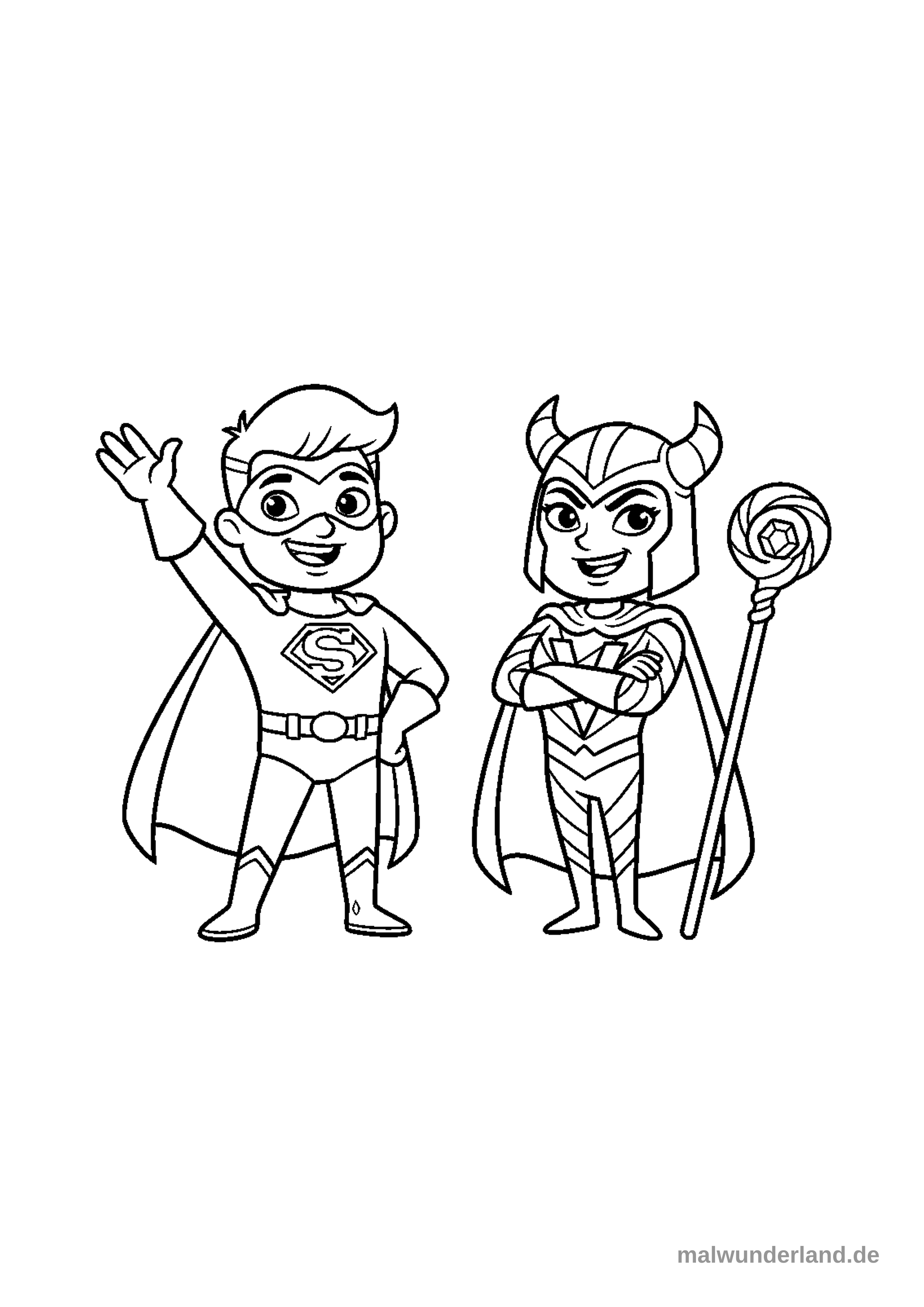 Das Bild zeigt zwei lachende Kinderfiguren in Superhelden- oder Fantasy-Kostümen im Zeichentrickstil. Links steht ein Junge mit Umhang, Maske und einem 'S'-Abzeichen, der winkt; rechts daneben eine Figur mit gehörntem Helm, Umhang und einem Stab mit Edelstein, die die Arme verschränkt.