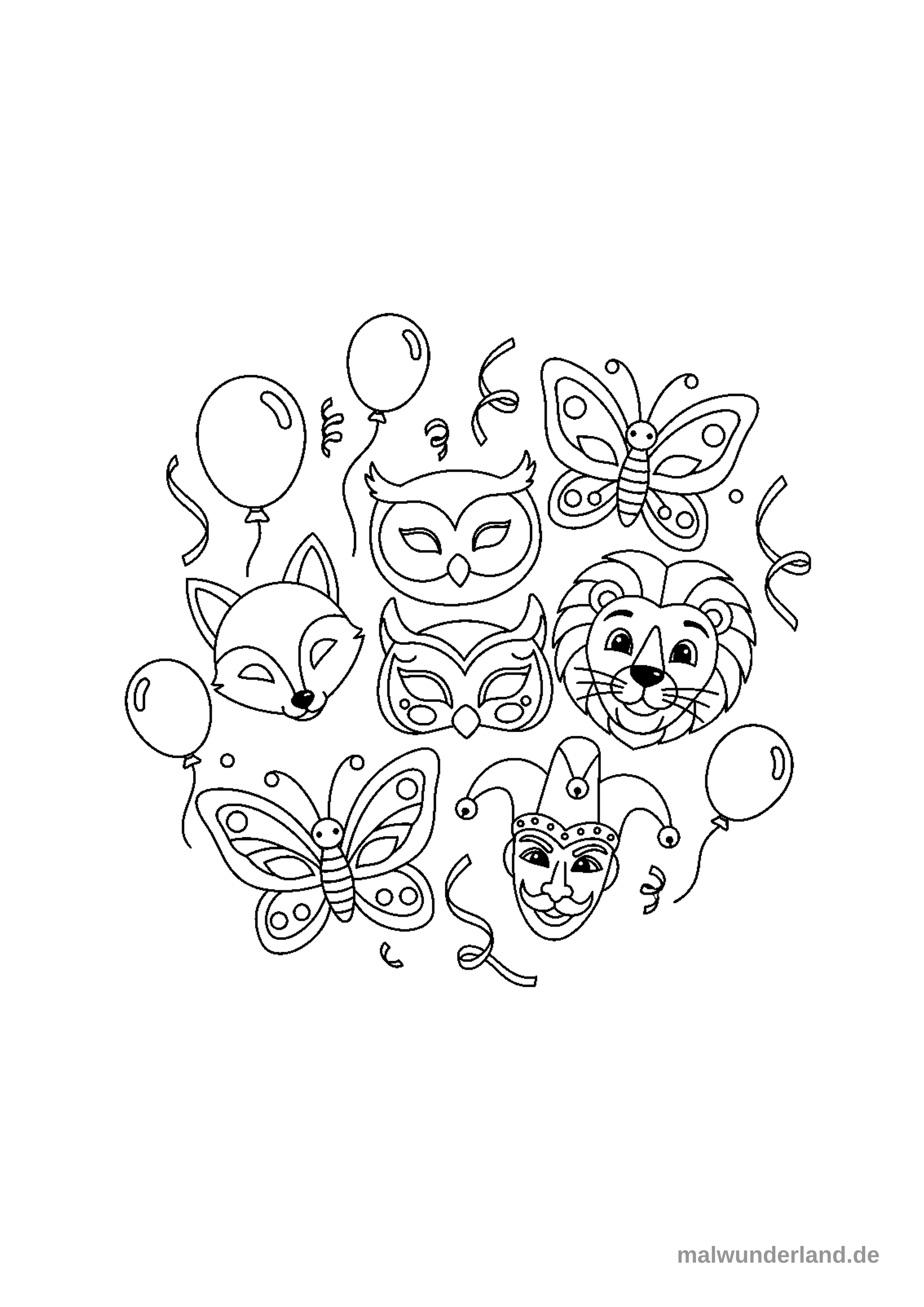 Das Bild zeigt eine kreisförmige Anordnung verschiedener Masken und Partydekorationen als Ausmalbild. Es sind Tiergesichtsmasken wie ein Fuchs, zwei Eulen, ein Löwe und zwei Schmetterlinge sowie eine Harlekin-Maske zu sehen, umgeben von Luftballons und Konfetti-Bändern.