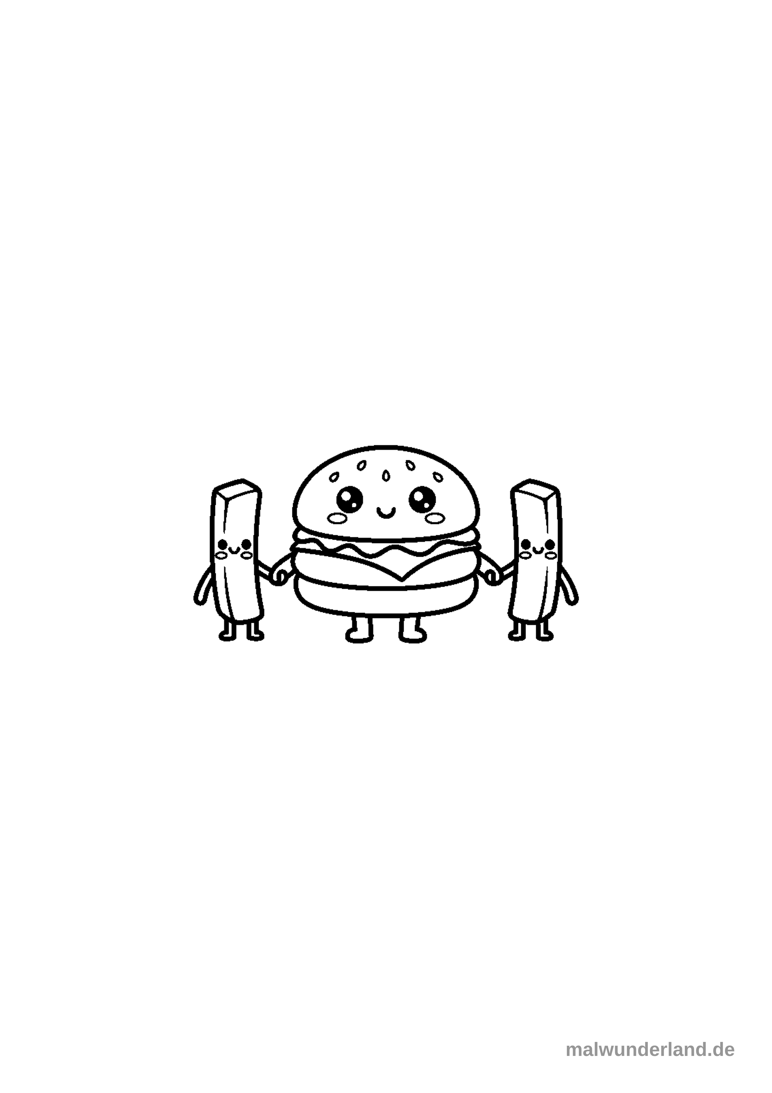 Ein lächelnder Burger hält Händchen mit zwei fröhlichen Pommes-Frites. Alle haben kleine, freundliche Gesichter.