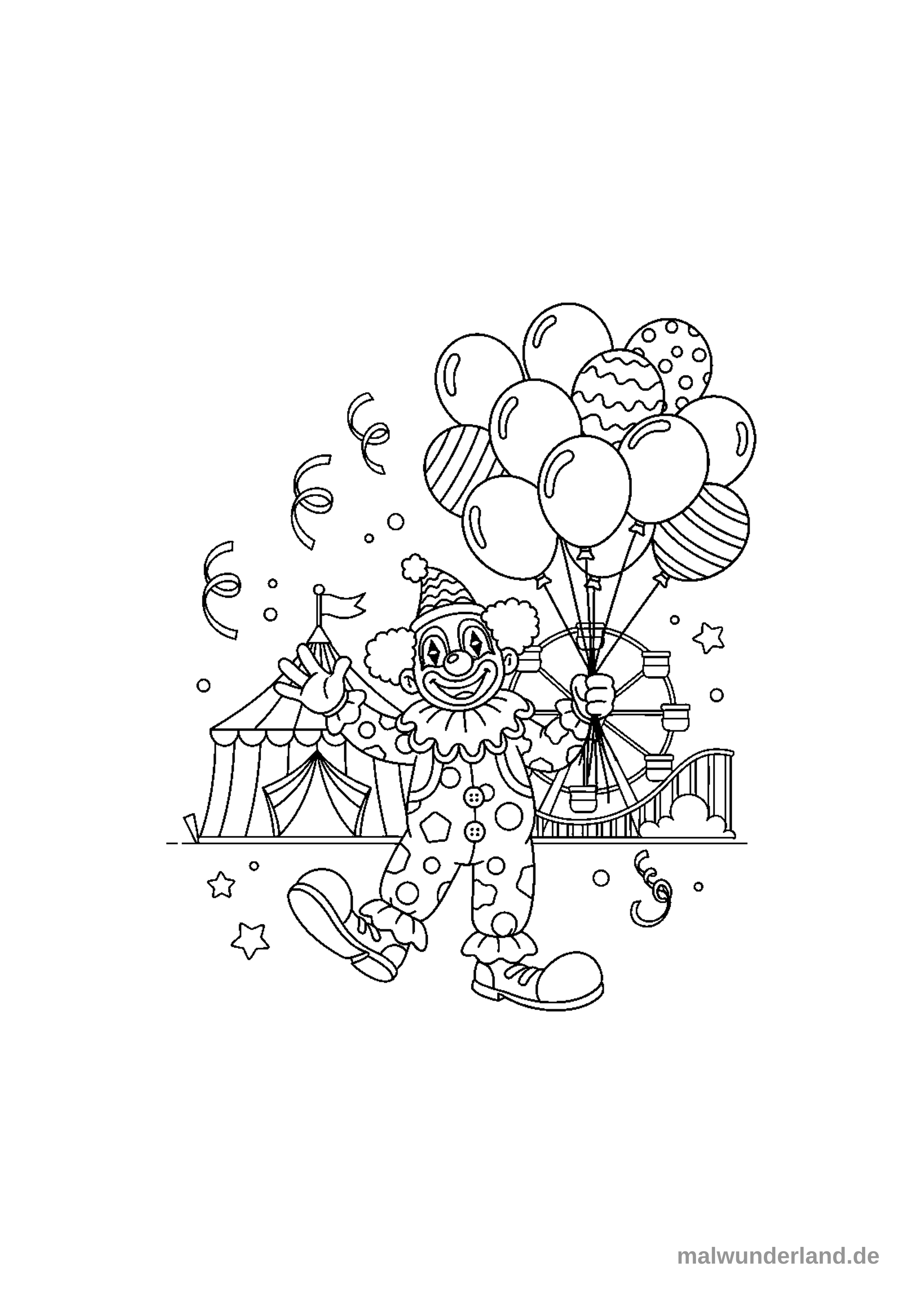 Ein fröhlicher Clown läuft mit einem großen Bündel Luftballons in einer Jahrmarkt- oder Zirkusszene. Im Hintergrund sind ein Zirkuszelt und ein Riesenrad zu sehen, umgeben von Konfetti und Sternen.