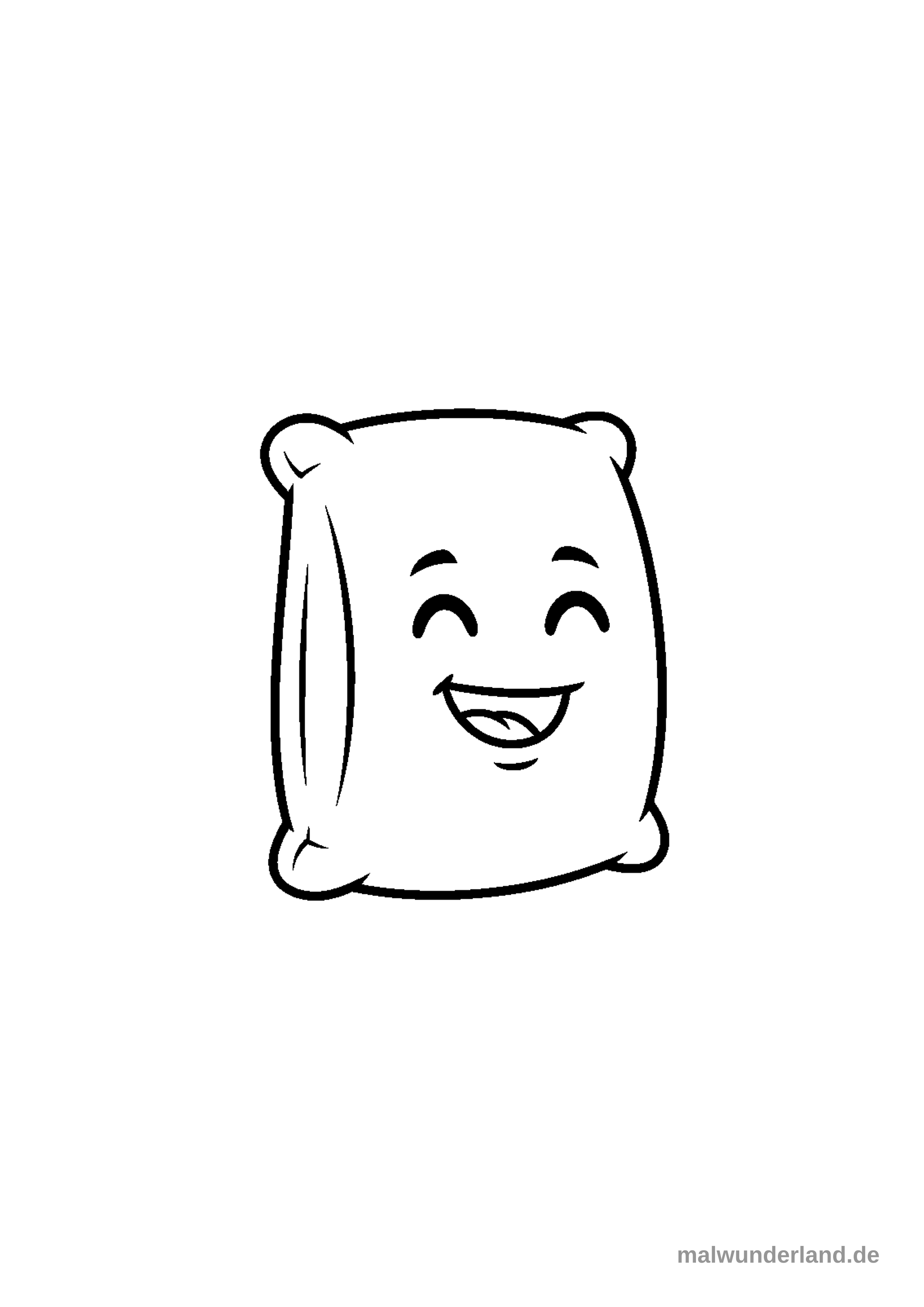 Das Bild zeigt eine schwarz-weiße Umrisszeichnung eines lächelnden Cartoon-Kissens. Es hat ein freundliches Gesicht mit geschlossenen Augen und einem geöffneten Mund, wobei eine Seitennaht angedeutet ist.