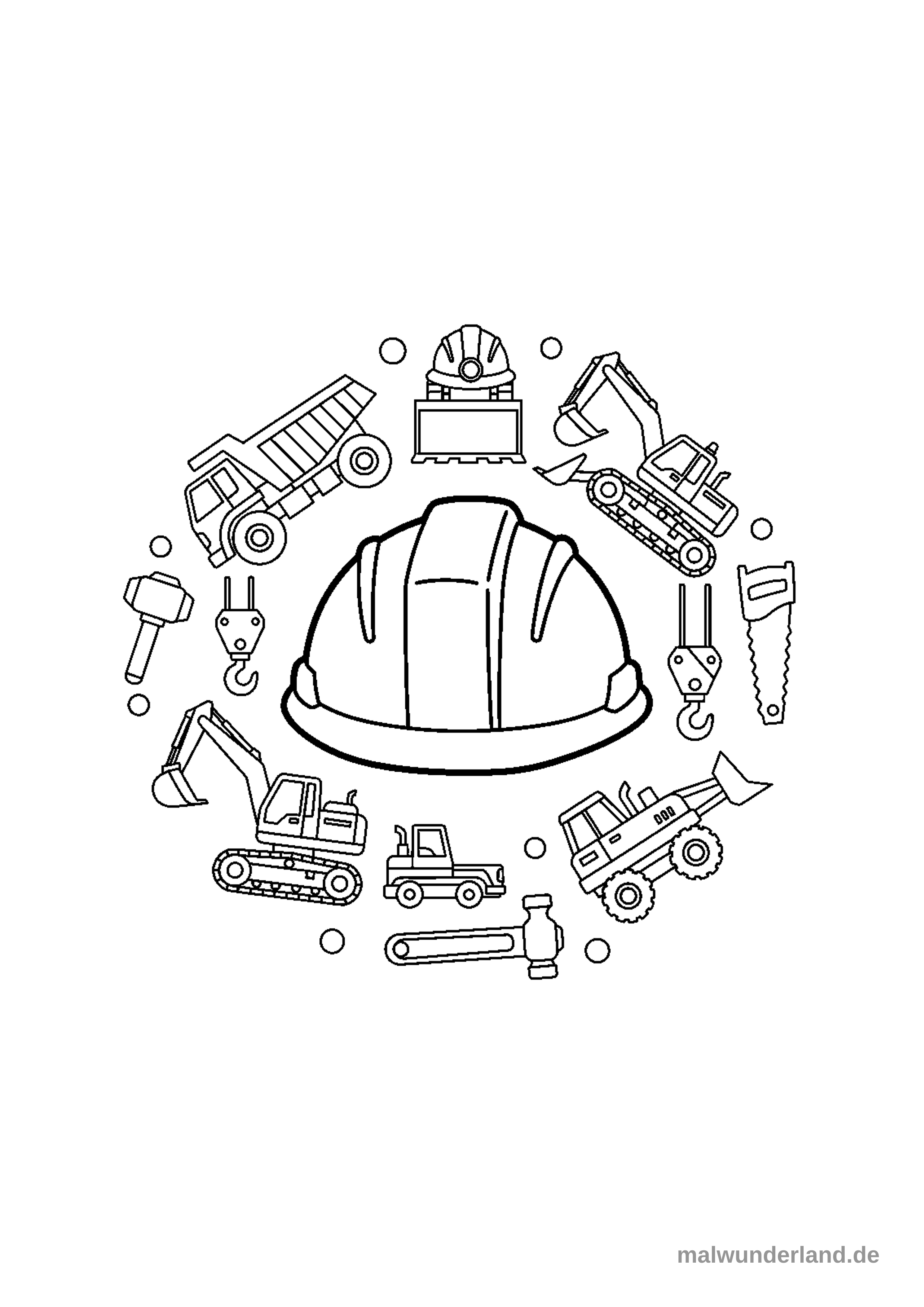Das Ausmalbild zeigt einen großen Bauhelm im Zentrum, der von zahlreichen Baustellenfahrzeugen wie Baggern, Lastwagen und Radladern sowie verschiedenen Werkzeugen umgeben ist. Kleine Kreise sind als dekorative Elemente im Bild verteilt.