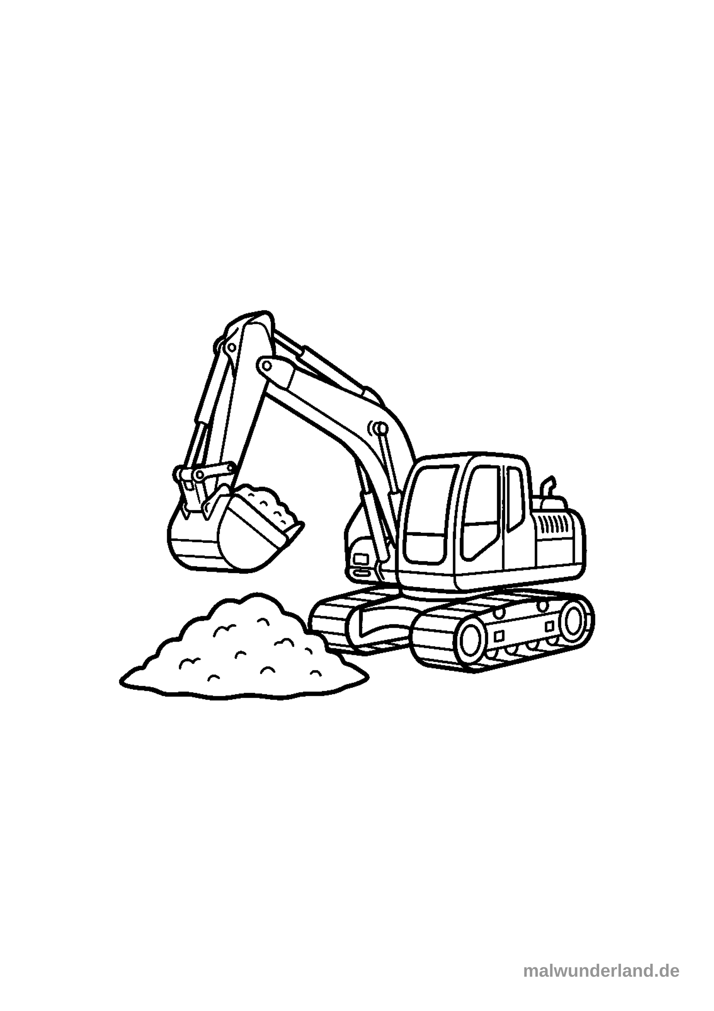 Das Ausmalbild zeigt einen großen Bagger in einer Seitenansicht, der mit seiner Schaufel Erde auf einen bereits vorhandenen Haufen schüttet. Der Bagger steht auf robusten Raupenketten vor dem Erdhaufen.