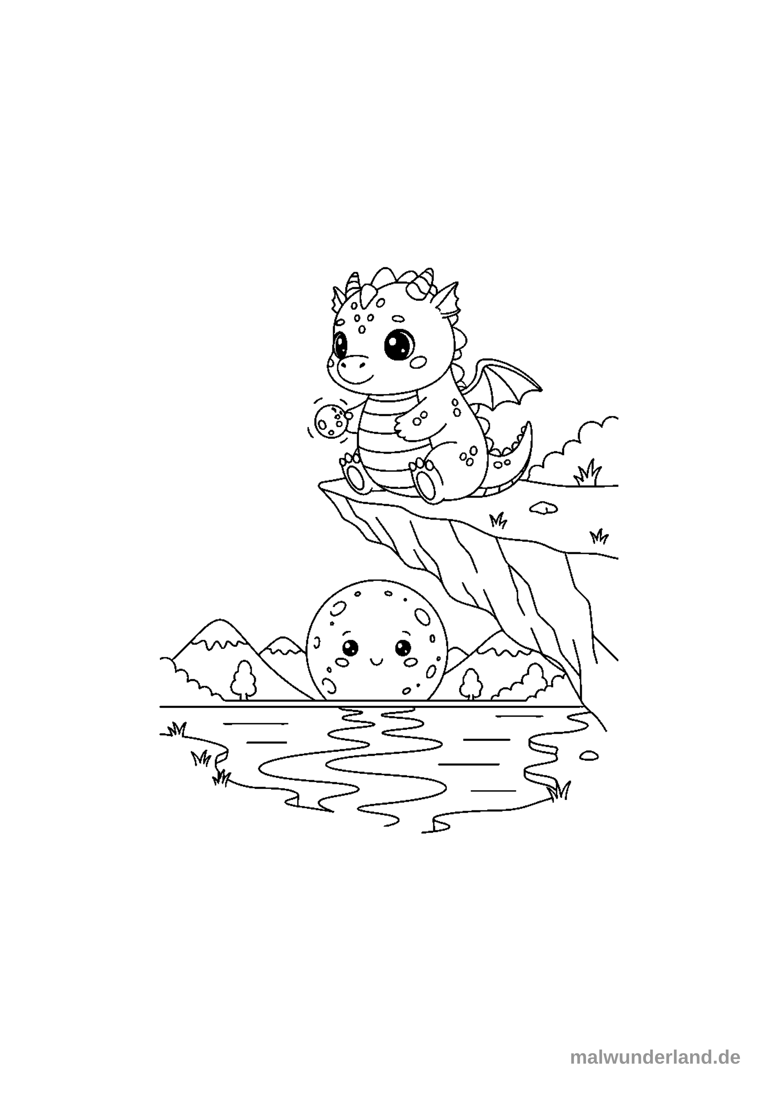 #drachen #fantasy #feuer #magie #flügel #schuppen #baby-drache #felsklippe #wasser #mondgesicht #gebirge #kleiner ball #sitzen #spielen #beobachten #spiegeln