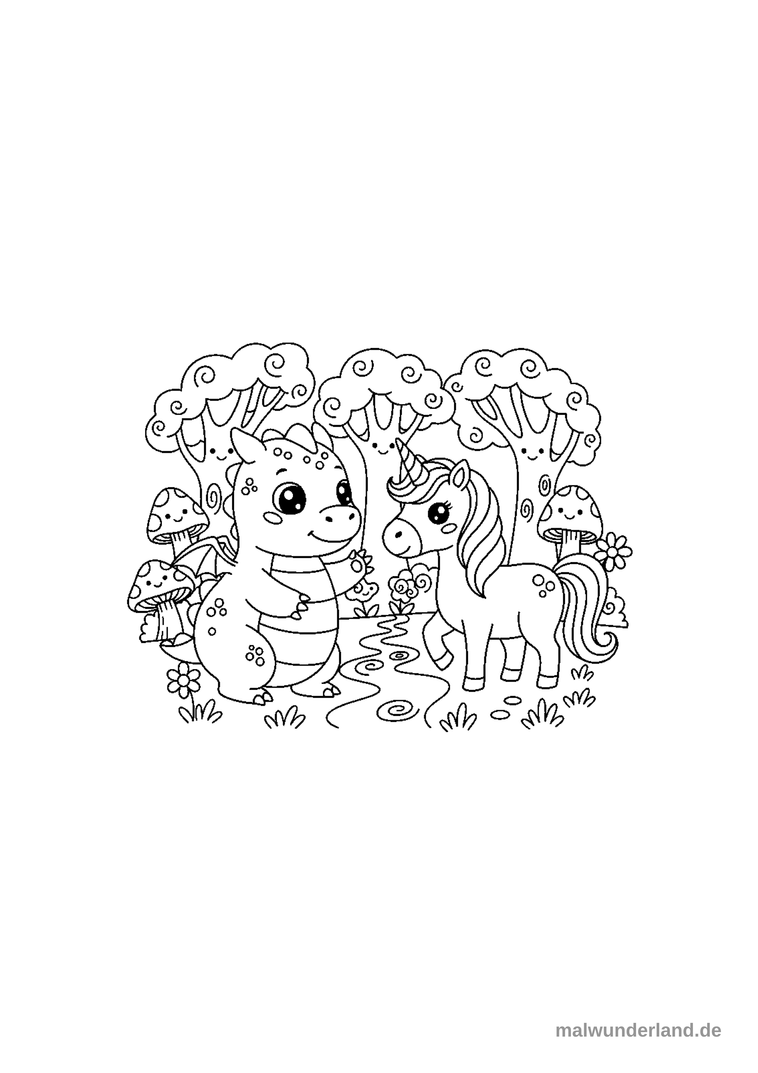 Ein freundlicher Drache begegnet einem Einhorn in einem verzauberten Wald. Beide Tiere sind detailliert dargestellt, umgeben von üppiger Vegetation mit filigranen Mustern.