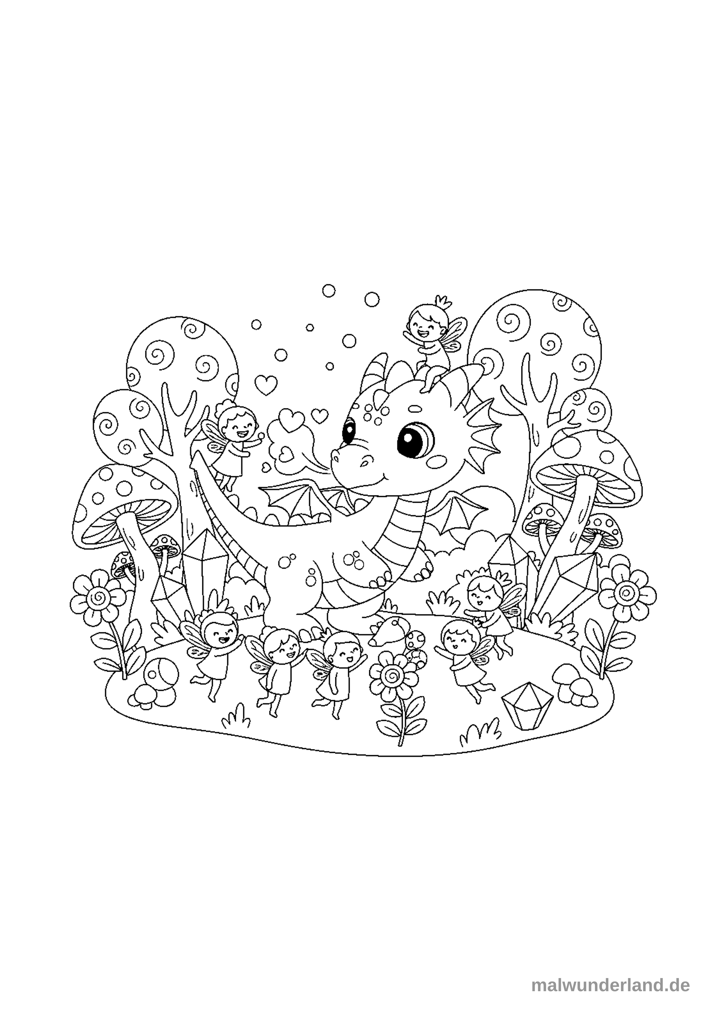 Ein verspielter Drache spielt mit kleinen Feen in einem magischen Garten. Der Drache ist freundlich und sanft, die Feen sind detailliert und zart gezeichnet.