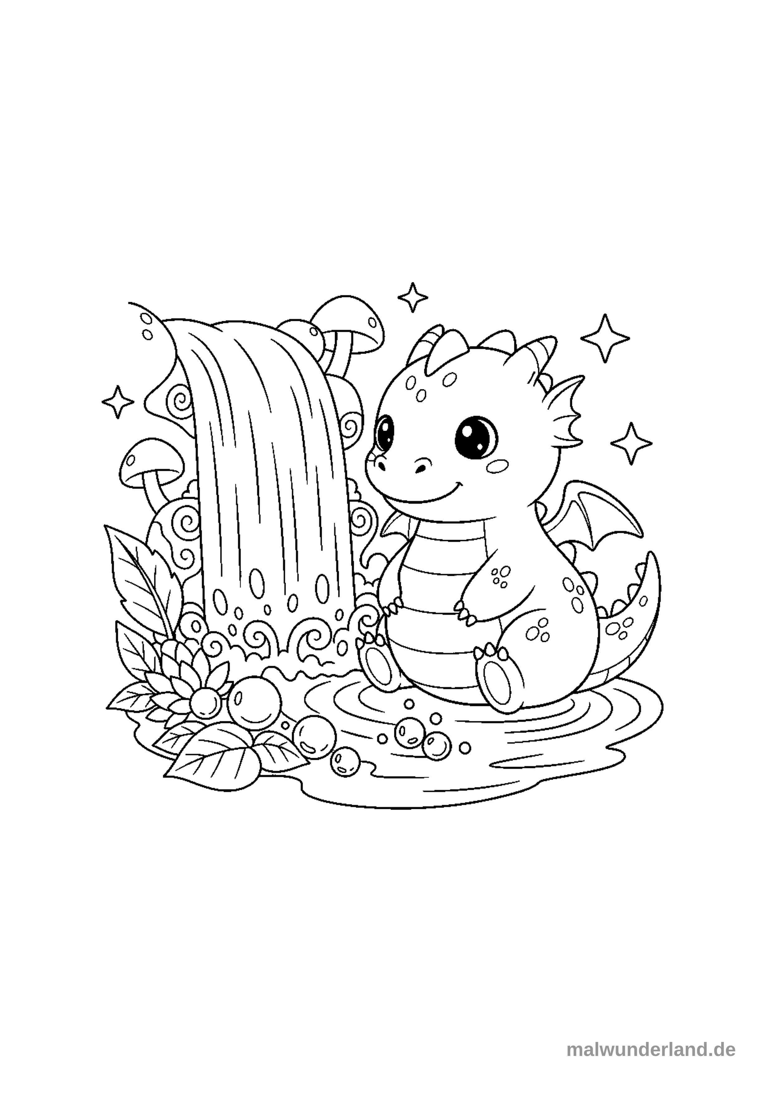 Blau- und Grüntöne für den Wasserfall. Bunte Farben für die Blumen und Pflanzen. Wählen Sie eine lebendige Farbe für den Drachen.