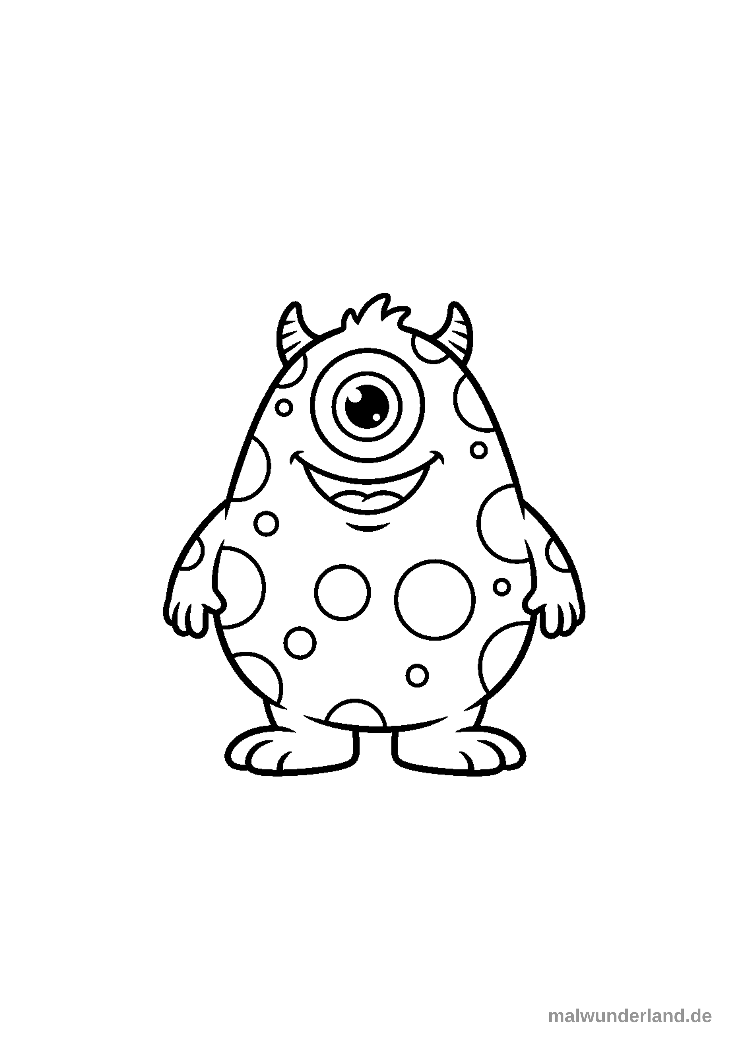 Das Bild zeigt ein freundlich lächelndes, einäugiges Monster im Umrissstil. Sein runder Körper ist mit vielen unterschiedlich großen Kreisen bedeckt, es hat kleine Hörner auf dem Kopf und steht auf zwei kleinen Füßen.