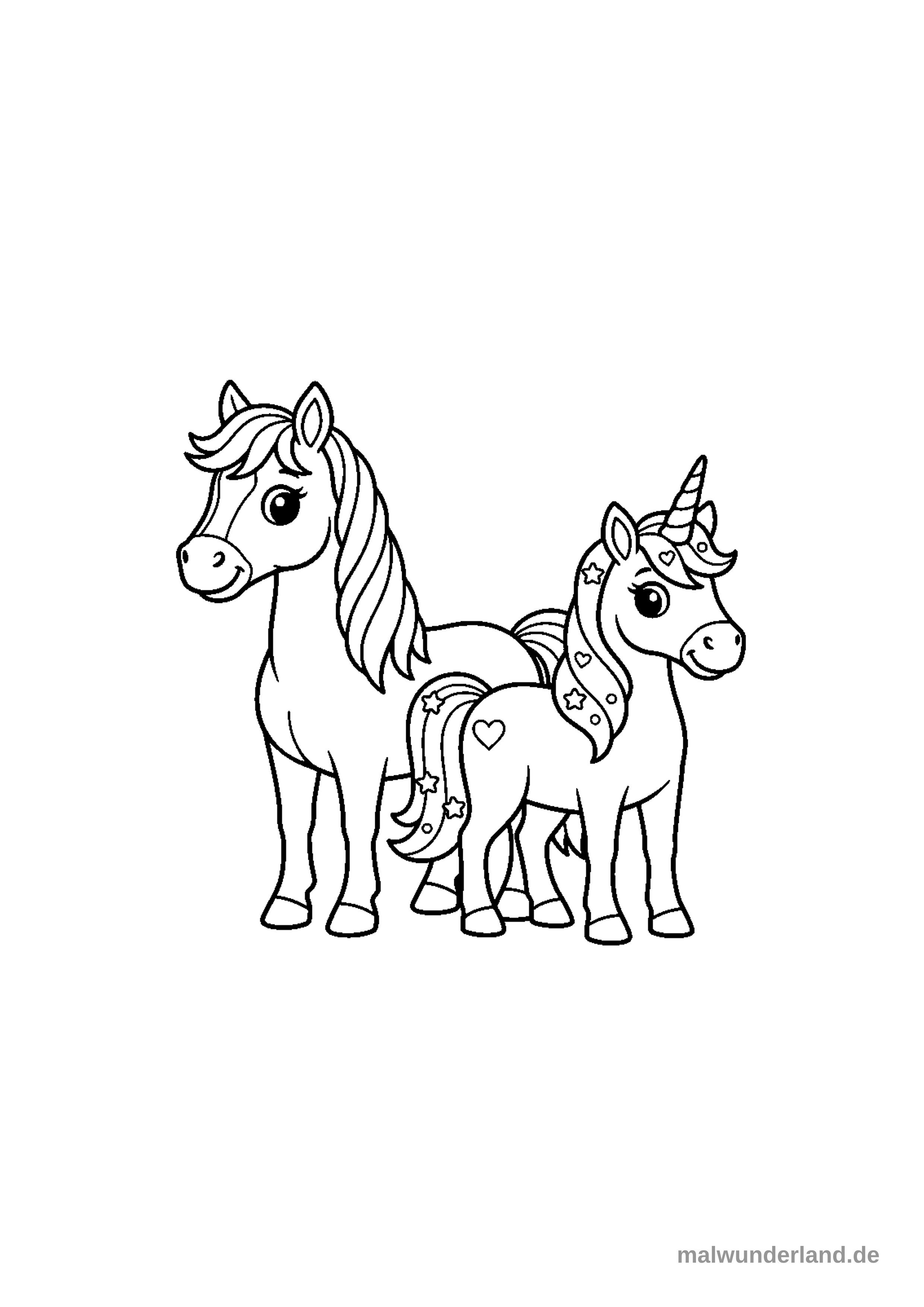 Das Bild zeigt ein Ausmalbild mit zwei nebeneinander stehenden, pferdeähnlichen Fabelwesen. Links ist ein größeres Pony oder Pferd zu sehen und rechts ein kleineres Einhorn mit einem Horn auf der Stirn.