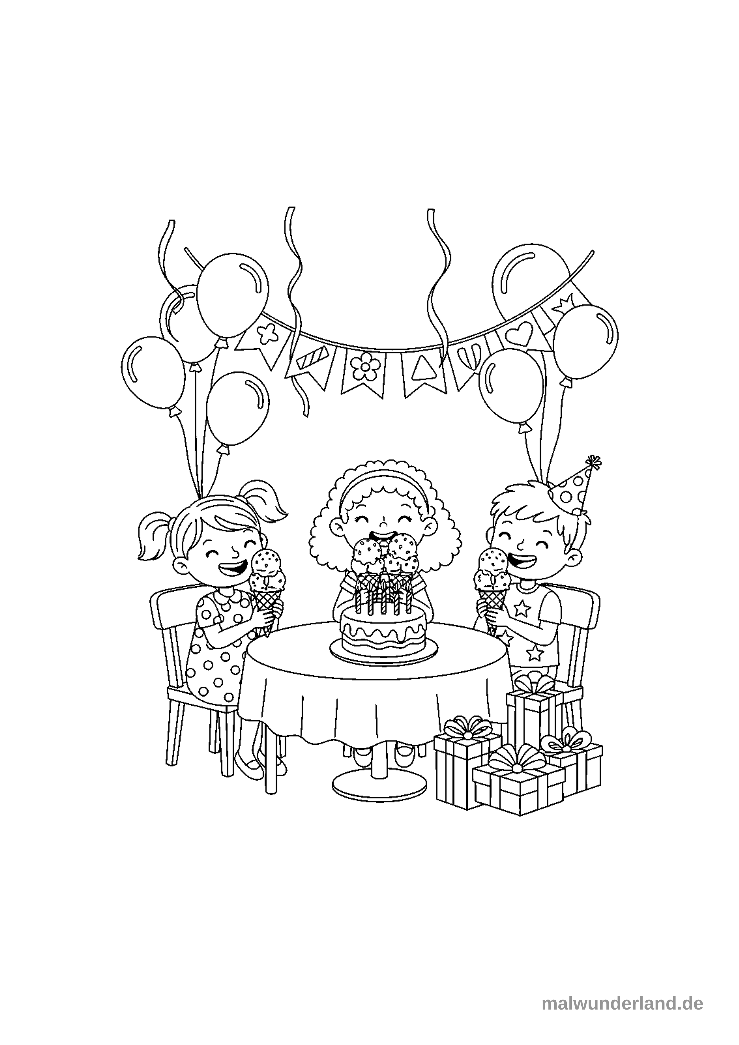 Das Ausmalbild zeigt drei fröhliche Kinder, die an einem runden Tisch sitzen und Eiscreme essen. In der Mitte des Tisches steht ein Geburtstagskuchen mit mehreren Kerzen, während um sie herum Geschenke, Luftballons und eine festliche Wimpelkette die Szene schmücken.