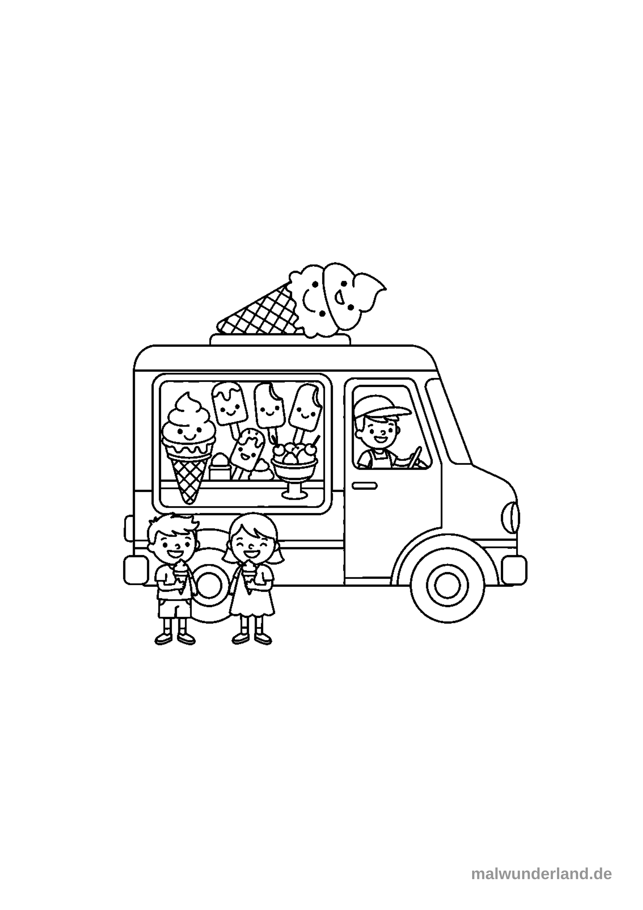 Ein Ausmalbild zeigt einen fröhlichen Eiscreme-Wagen mit einem lächelnden Fahrer am Steuer. Vor dem Wagen stehen ein Junge und ein Mädchen, die jeweils ein Eis in der Hand halten und sich freuen. Auf dem Dach des Wagens und im Verkaufsfenster sind zudem weitere lustige Eiscreme-Figuren und Eissorten abgebildet.