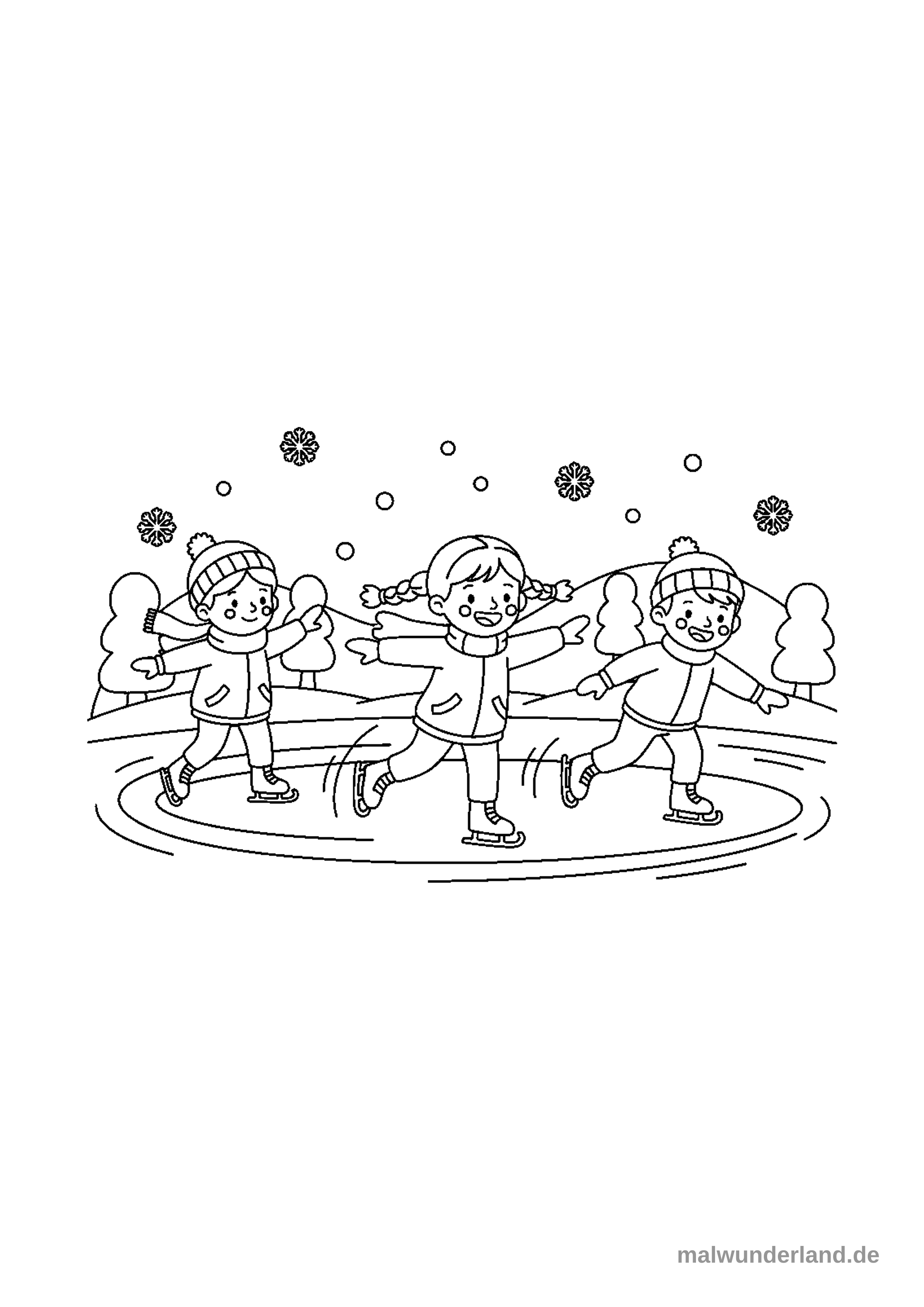 Das Ausmalbild zeigt drei fröhliche Kinder, die auf einem Eisring Schlittschuh laufen. Im Hintergrund sind mehrere Bäume zu sehen und es fallen Schneeflocken vom Himmel.