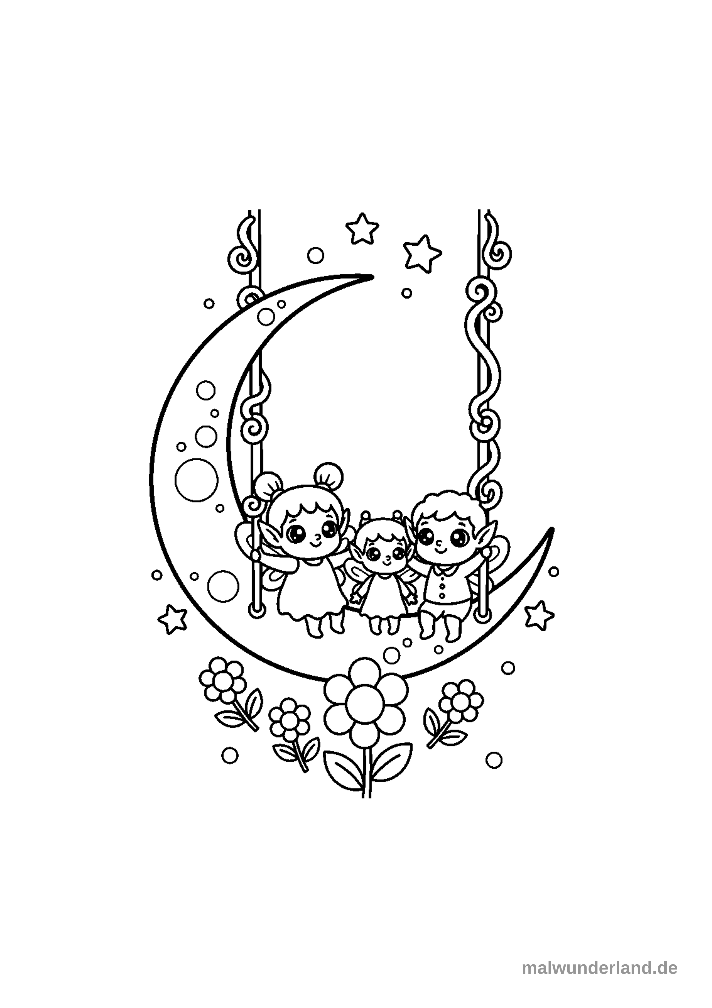 Zwei Elfen schaukeln auf einer Mondschaukel hoch oben am Himmel.