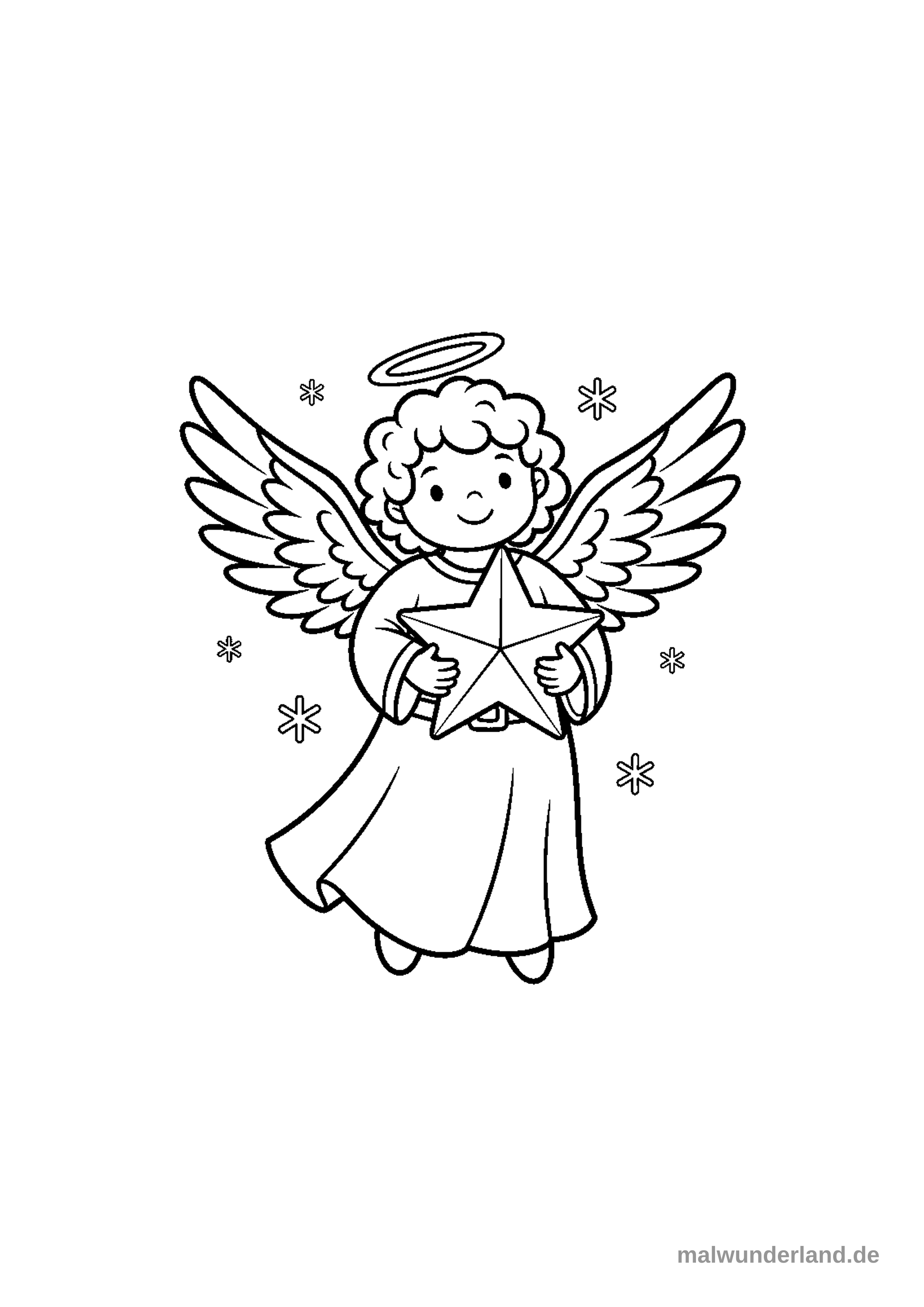 Das Ausmalbild zeigt einen freundlich lächelnden Engel mit lockigem Haar und einem Heiligenschein. Der Engel trägt ein langes Gewand, hat große Flügel und hält einen fünfzackigen Stern in seinen Händen, umgeben von kleinen Schneeflocken.