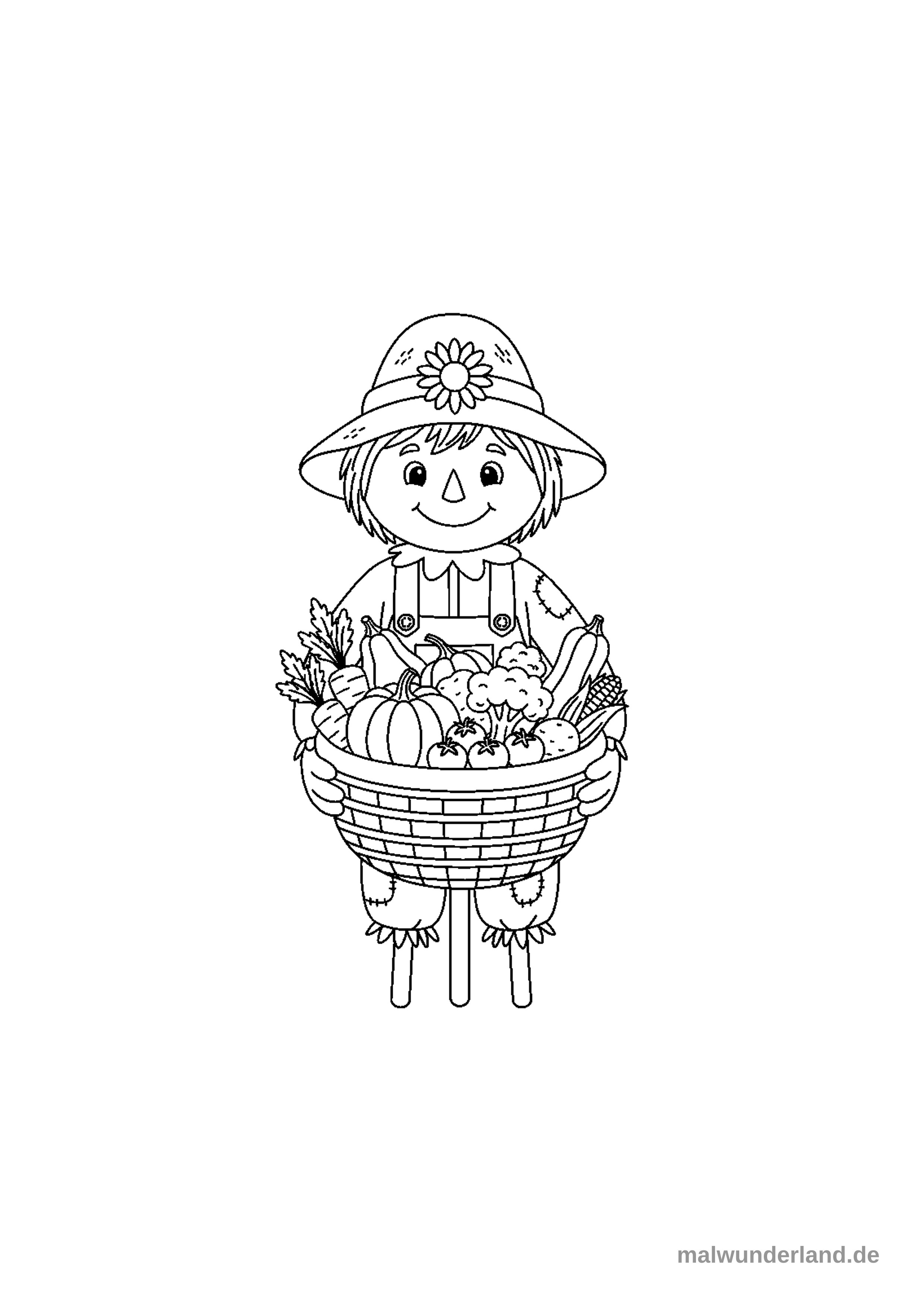 Eine lächelnde Vogelscheuche trägt einen großen Korb, der prall gefüllt ist mit verschiedenen frischen Gemüsesorten. Die Vogelscheuche ist detailliert gezeichnet und hält den Korb fest in ihren Stroh-Händen.