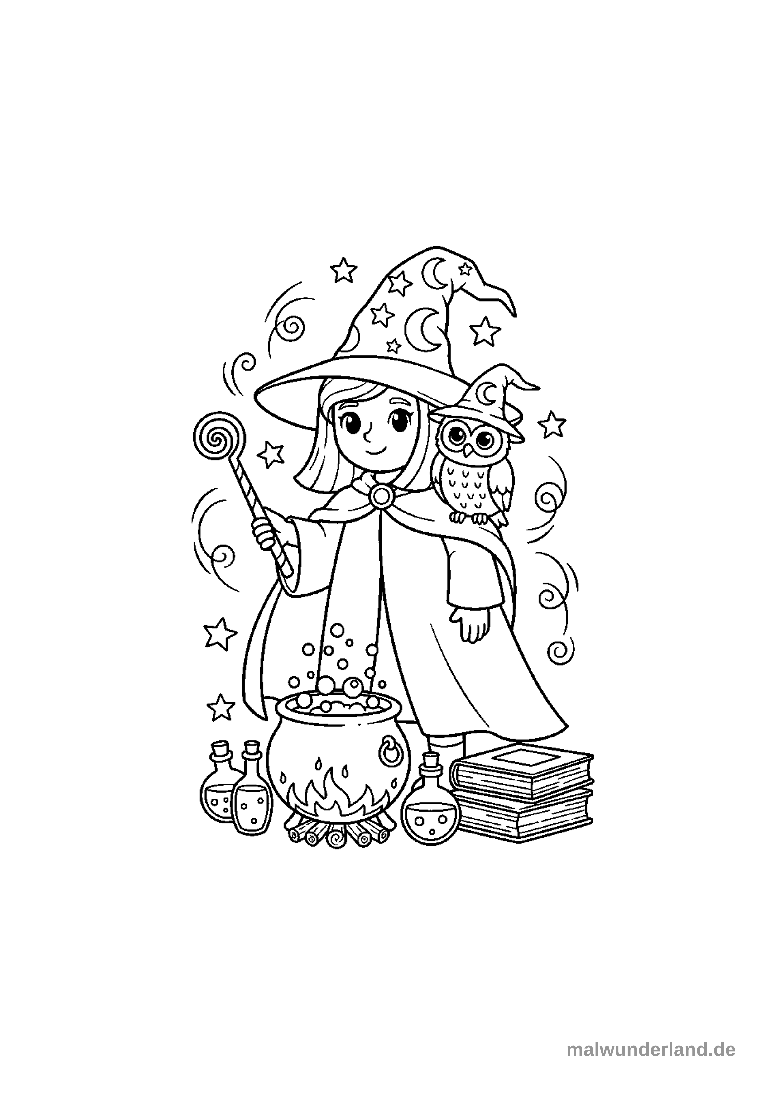 Das Ausmalbild zeigt ein junges Mädchen in einem Zaubererkostüm mit spitzem Hut und Umhang, das einen Zauberstab hält. Auf ihrer Schulter sitzt eine kleine Eule mit einem eigenen Zauberhut, während vor ihnen ein brodelnder Kessel auf einem Feuer steht, umgeben von Zauberflaschen und einem Stapel Bücher.