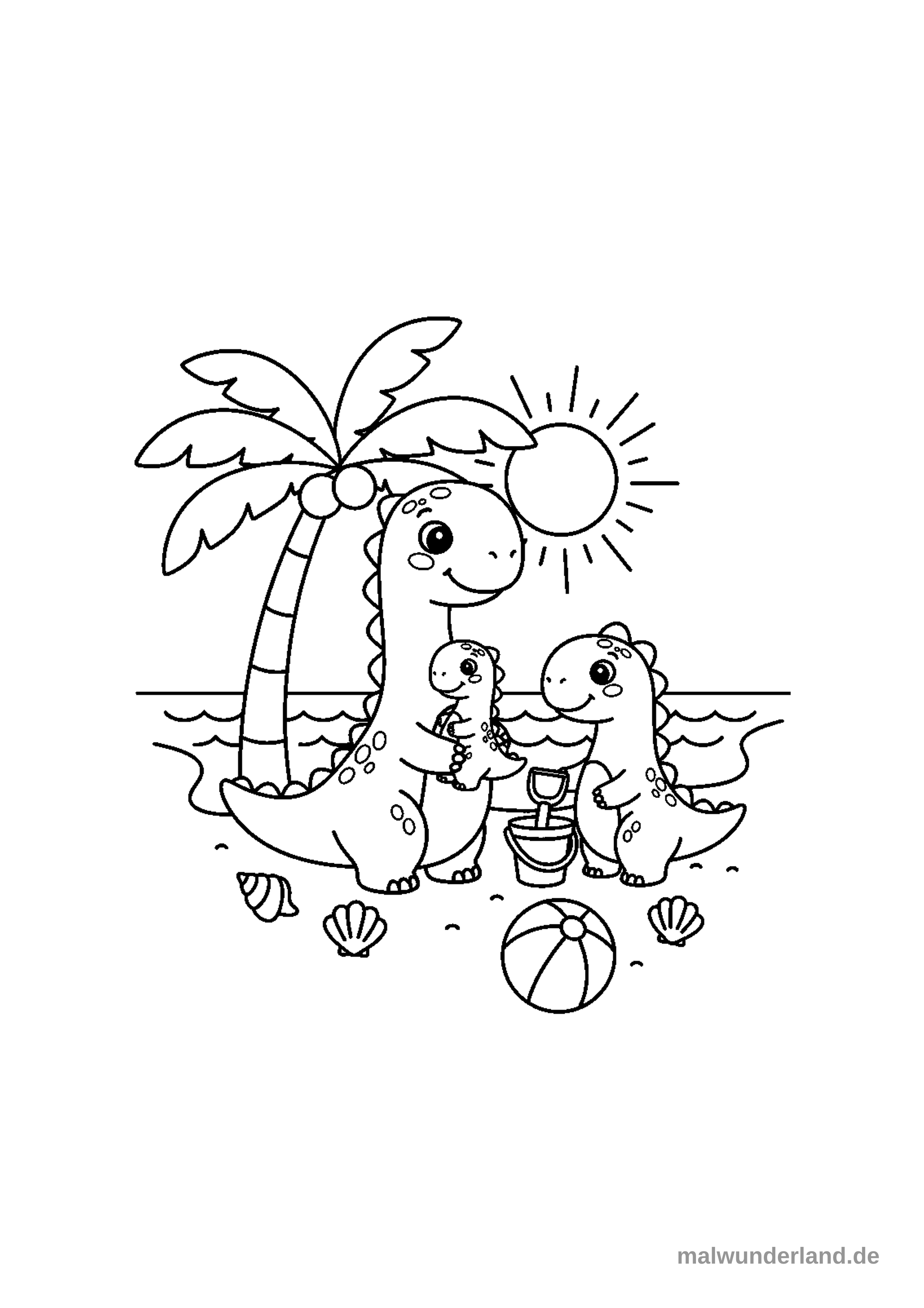 Male den großen Dinosaurier in einem kräftigen Grün. Er könnte auch einen braunen Rücken haben. Das kleine Dino-Baby kannst du in einem helleren Grün oder einem sanften Beige ausmalen. Das Meer färbst du in verschiedenen Blautönen, von Hellblau bis Türkis, und die Wellenspitzen kannst du weiß lassen. Die Palmen bekommen braune Stämme und leuchtend grüne Blätter. Die Felsen am Strand könntest du grau oder erdbraun gestalten.