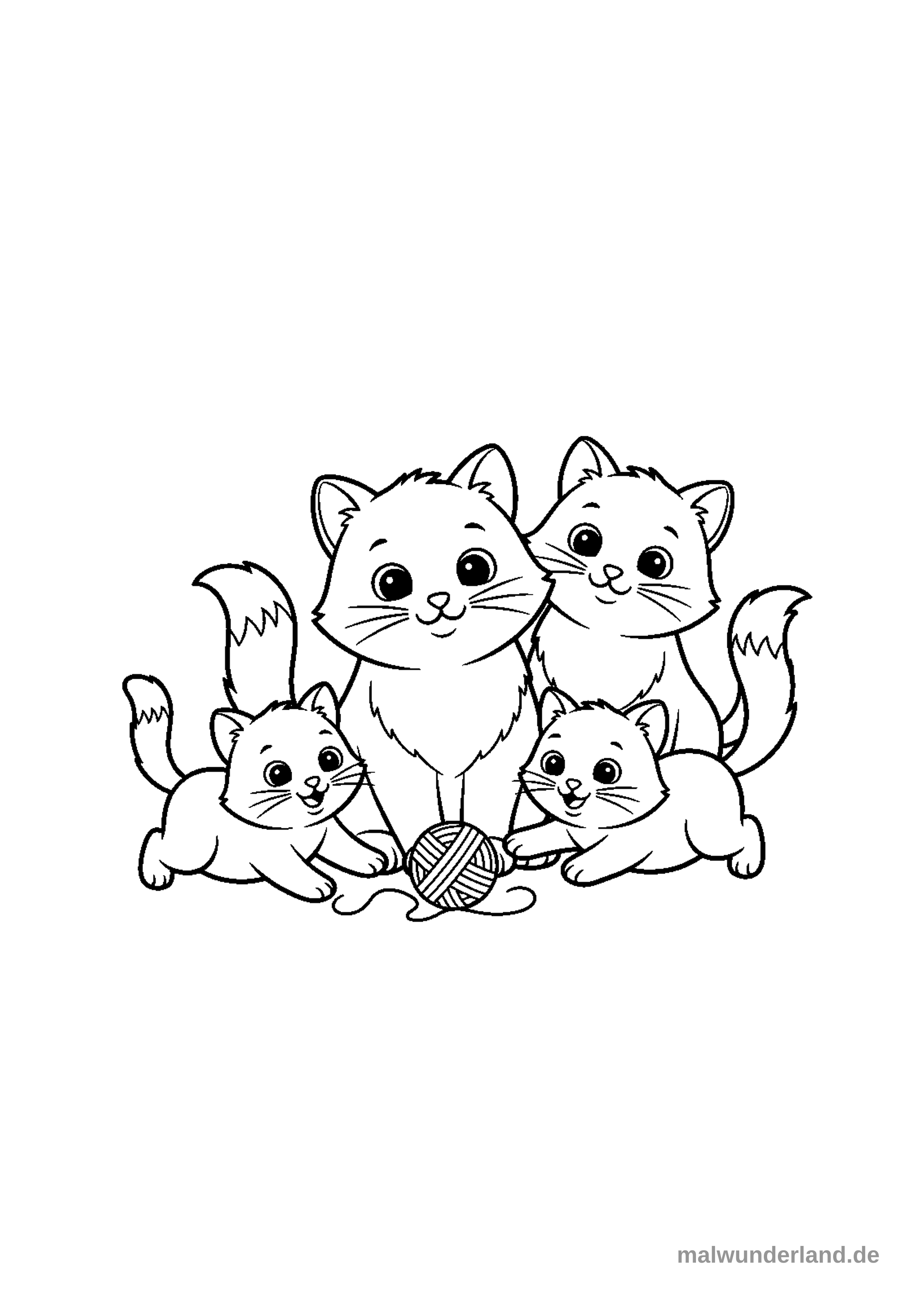 Das Bild zeigt vier niedliche Zeichentrickkatzen: zwei größere Katzen und zwei kleinere Kätzchen, die alle lächeln. Ein Wollknäuel liegt vor den Kätzchen, die damit spielen.