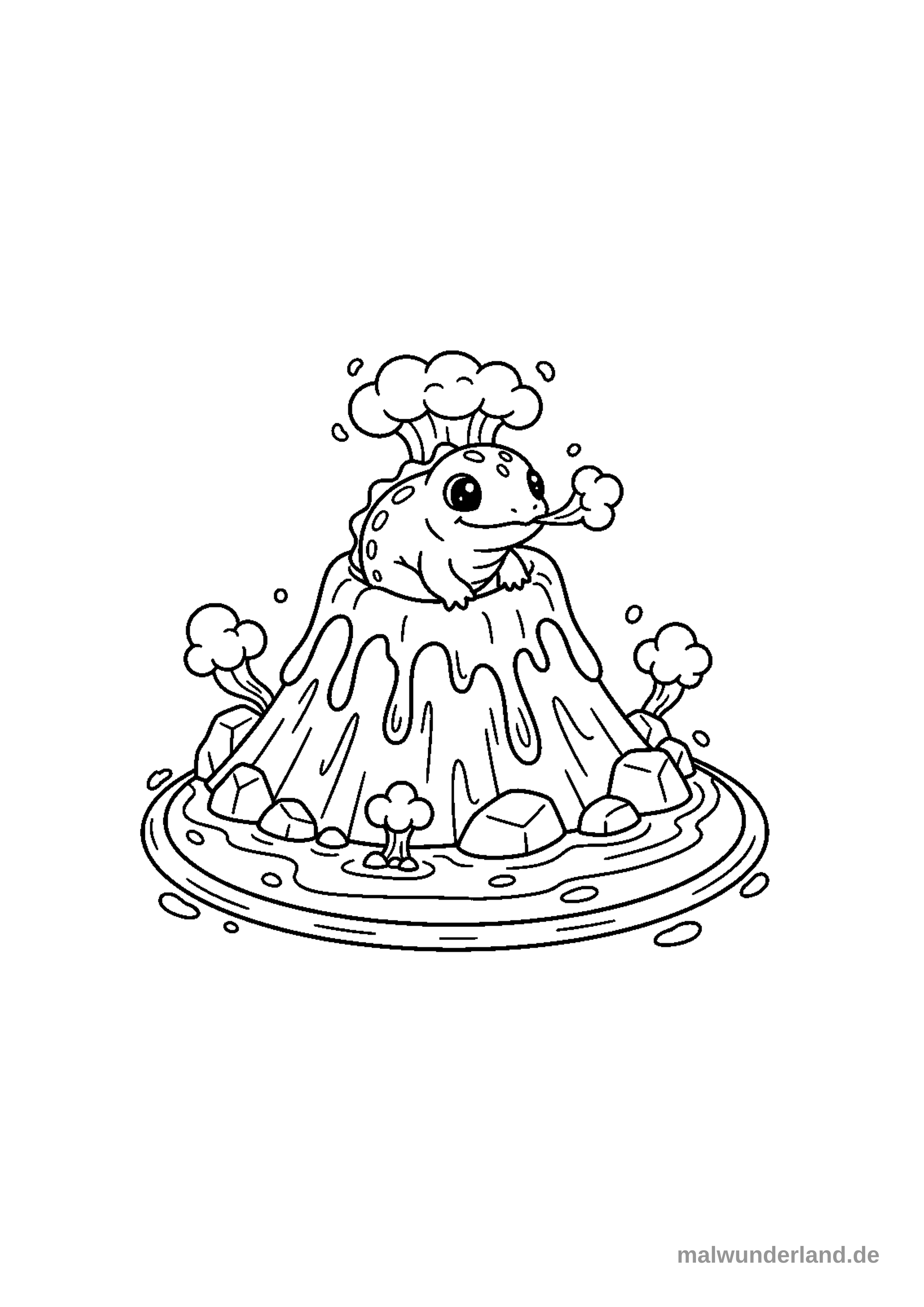Ein Salamander, der in einem Vulkan lebt. Lava fließt um ihn herum, und er atmet Rauch aus.
