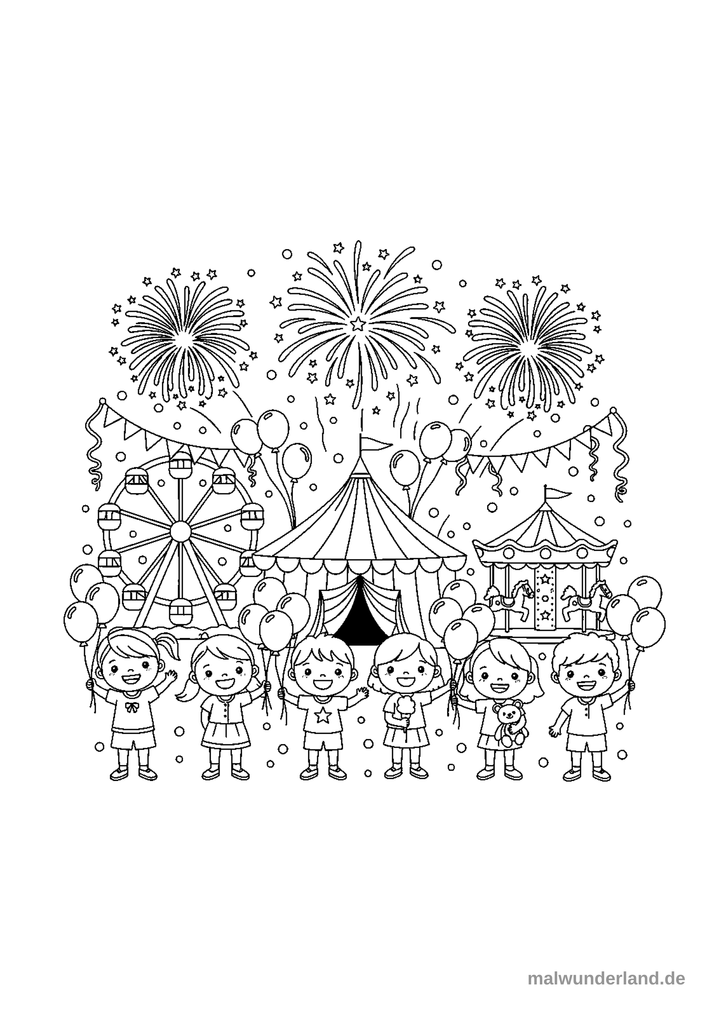 Das Ausmalbild zeigt eine fröhliche Rummelplatzszene mit einem Riesenrad, einem großen Zirkuszelt und einem Karussell, über denen drei Feuerwerke den Himmel erhellen. Im Vordergrund stehen sechs lachende Kinder, die jeweils Ballons halten; eine trägt Eis, eine andere einen Teddybär.