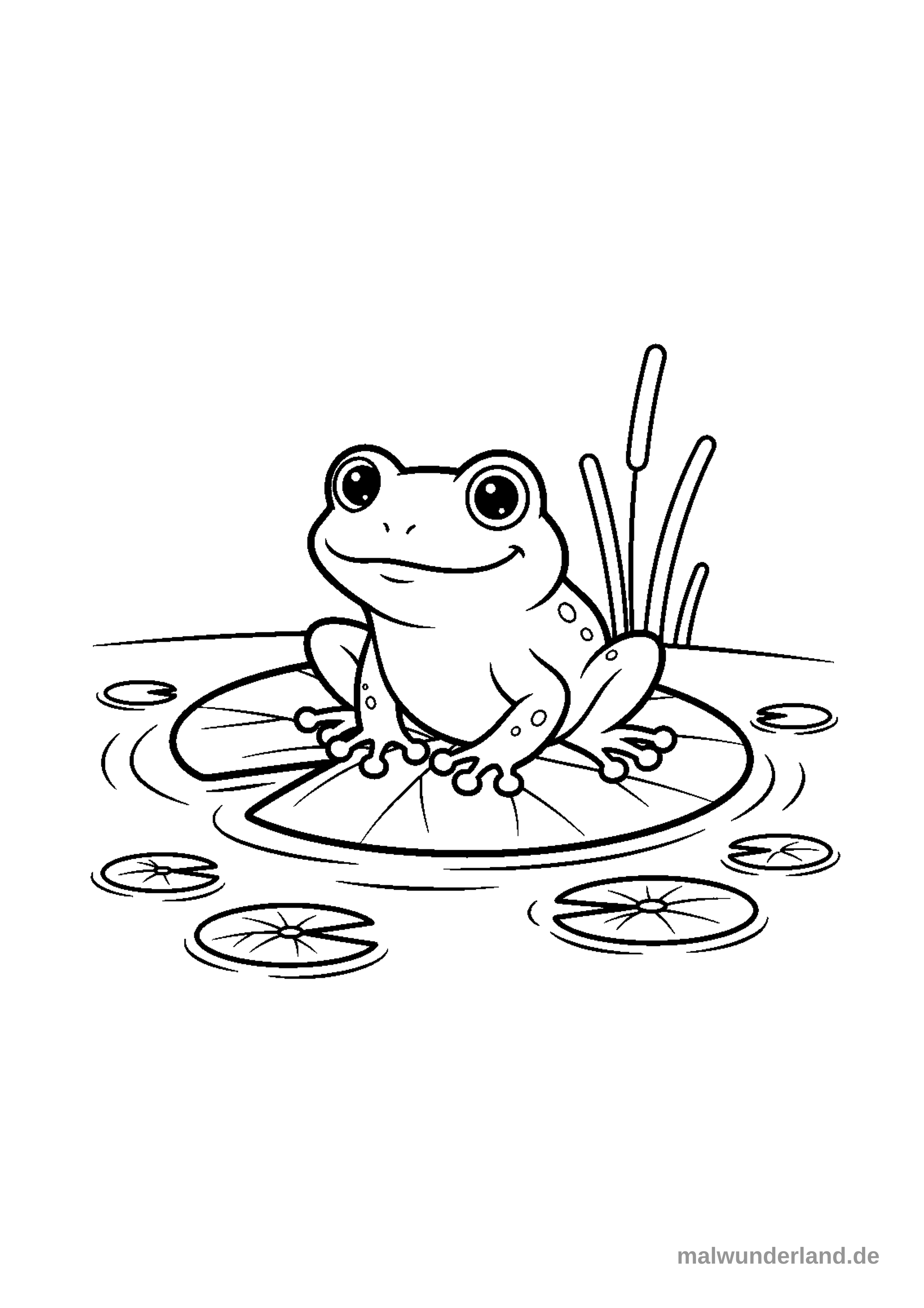 Male den Frosch in einem kräftigen Grün. Seine Bäuchlein und die Punkte könnten ein helleres Grün oder Gelb sein. Die Seerosenblätter kannst du in verschiedenen Grüntönen ausmalen. Die großen Blätter könnten ein sattes Grün haben, während die kleineren Blätter hellgrün sind. Das Wasser male in einem schönen Blauton, die Wellenringe kannst du mit einem helleren Blau hervorheben. Die Schilfhalme im Hintergrund könnten braun oder ein dunkles Grün sein.