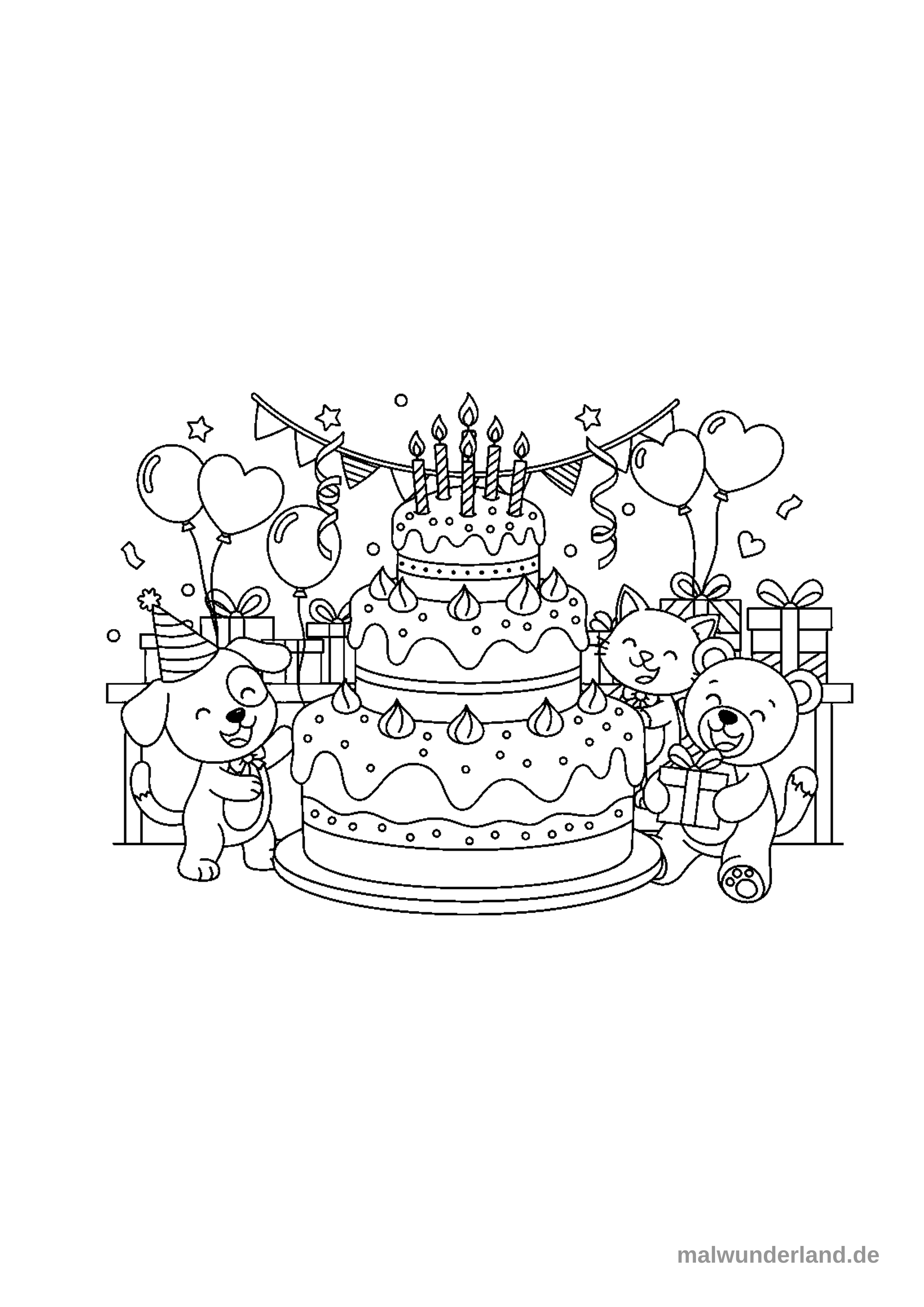 Das Ausmalbild zeigt eine fröhliche Geburtstagsszene mit einem großen dreistöckigen Kuchen, der mit sechs Kerzen und Zuckerguss verziert ist. Ein Hund mit Partyhut, eine Katze und ein Bär feiern um den Kuchen herum, umgeben von Ballons, Geschenken und Partygirlanden.