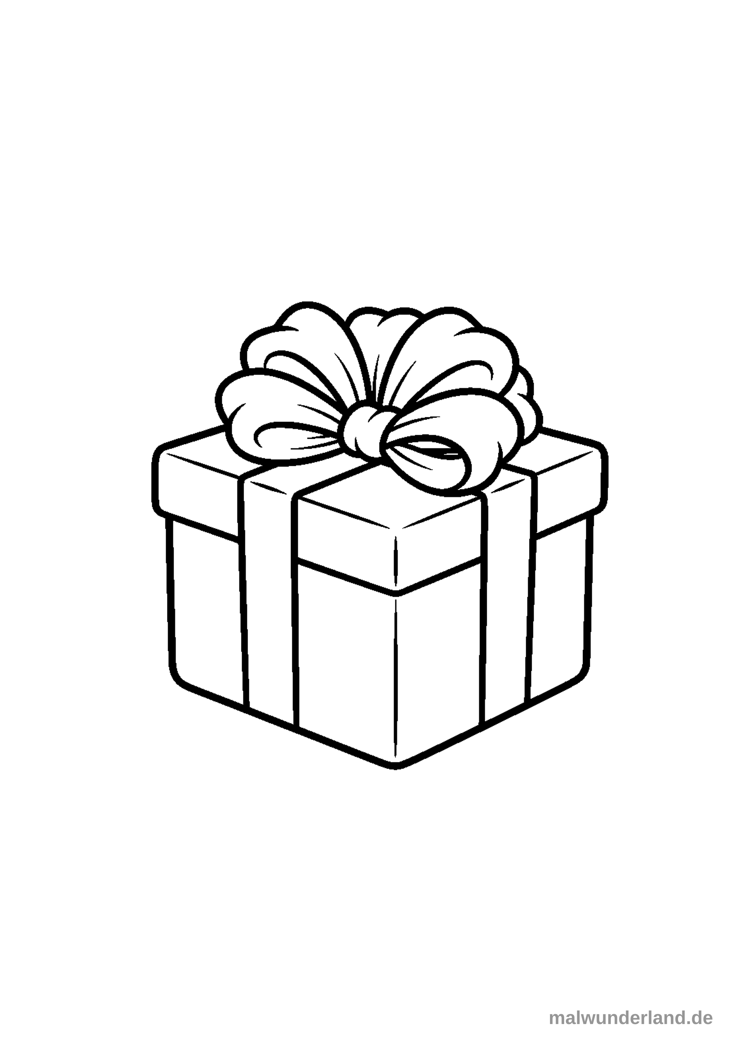 Das Bild zeigt eine Geschenkbox, die mit einem Band umwickelt ist und oben eine große, voluminöse Schleife trägt. Es ist eine schwarz-weiße Strichzeichnung, die zum Ausmalen gedacht ist.