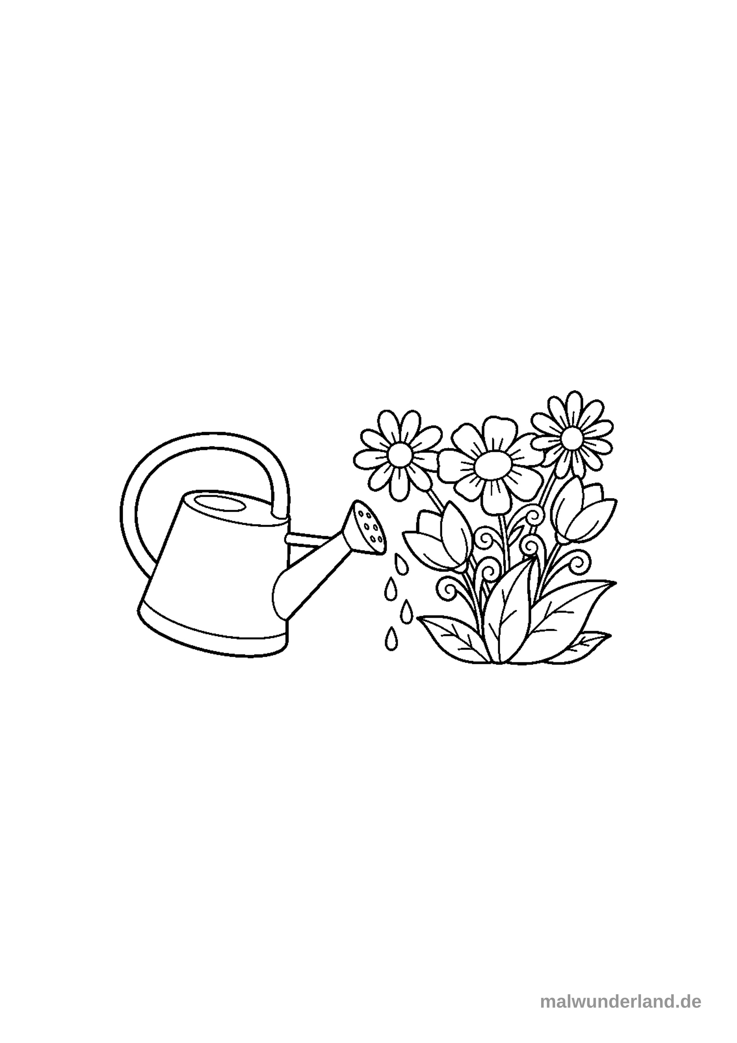 Das Ausmalbild zeigt eine Gießkanne, die schräg links platziert ist und gerade Wasser auf einen dichten Blumenbusch gießt. Aus der Tülle der Kanne fallen mehrere Wassertropfen in Richtung der Blüten und Blätter.