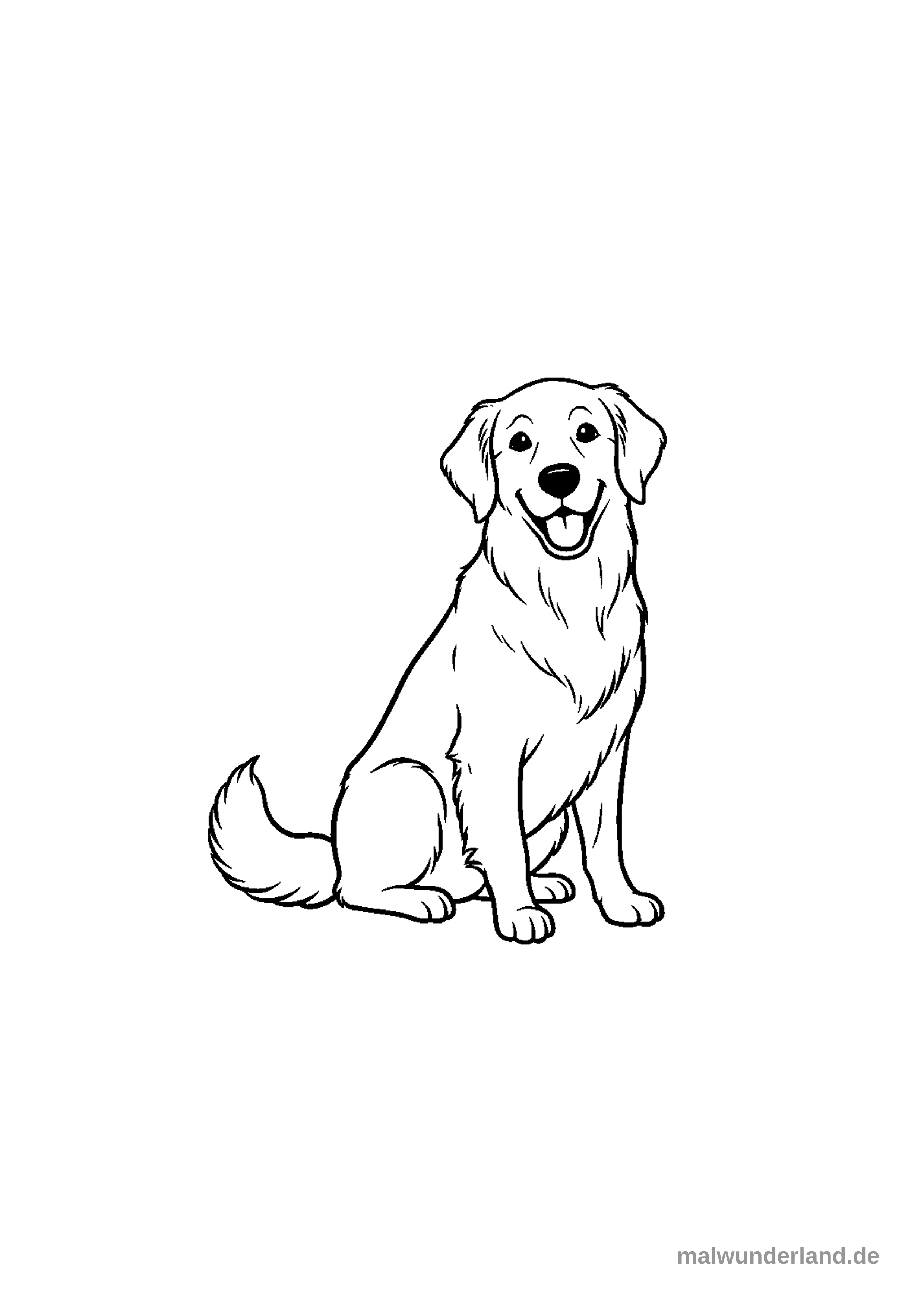 Das Bild zeigt die Schwarz-Weiß-Umrisse eines sitzenden Golden Retrievers. Der Hund hat ein freundliches Gesicht mit offenem Maul und herabhängenden Ohren.