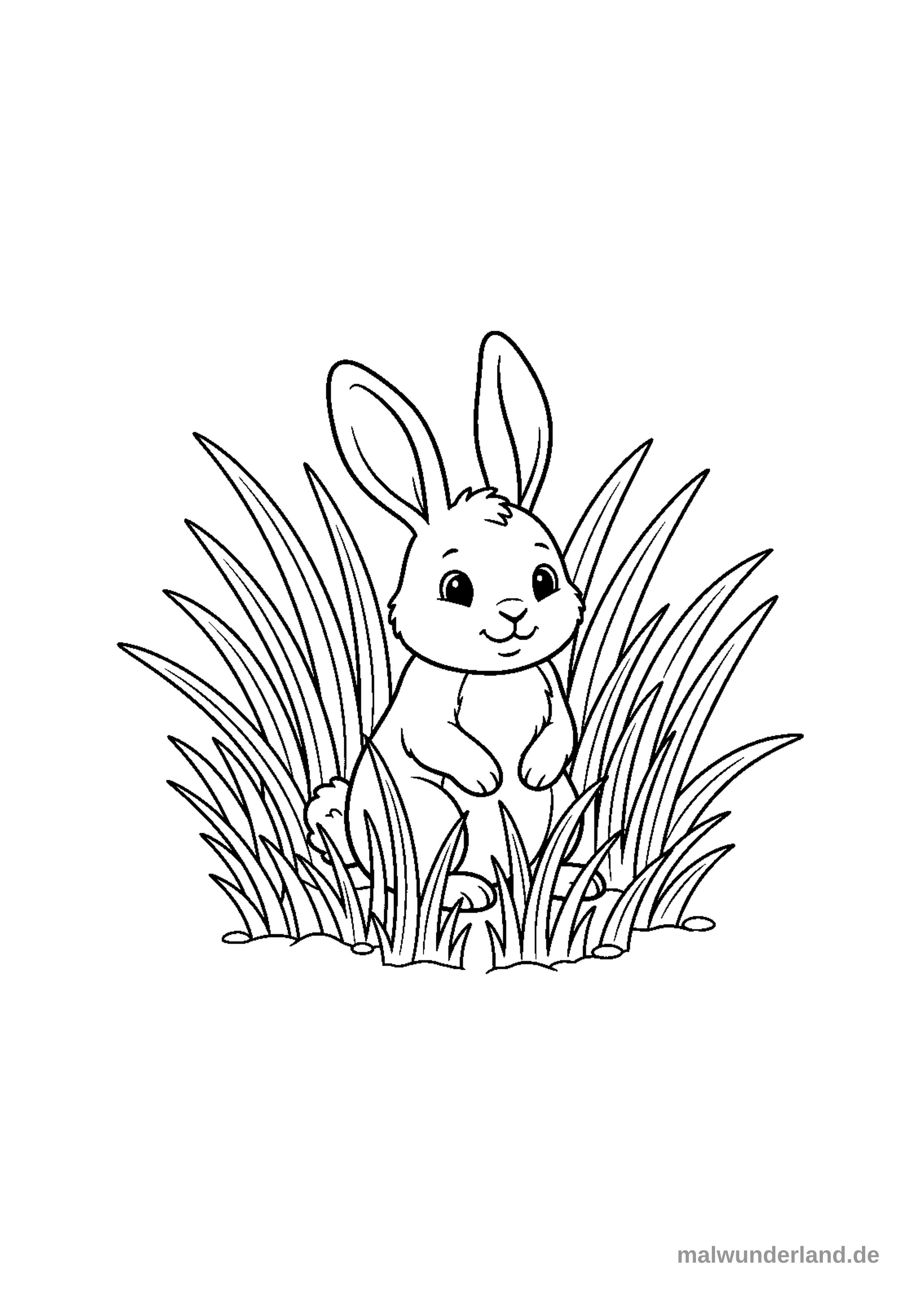 Ein niedlicher, lächelnder Hase mit langen Ohren sitzt aufrecht inmitten von hohem Gras und blickt den Betrachter an. Das Bild ist eine schwarz-weiße Umrisszeichnung, die zum Ausmalen bereit ist.