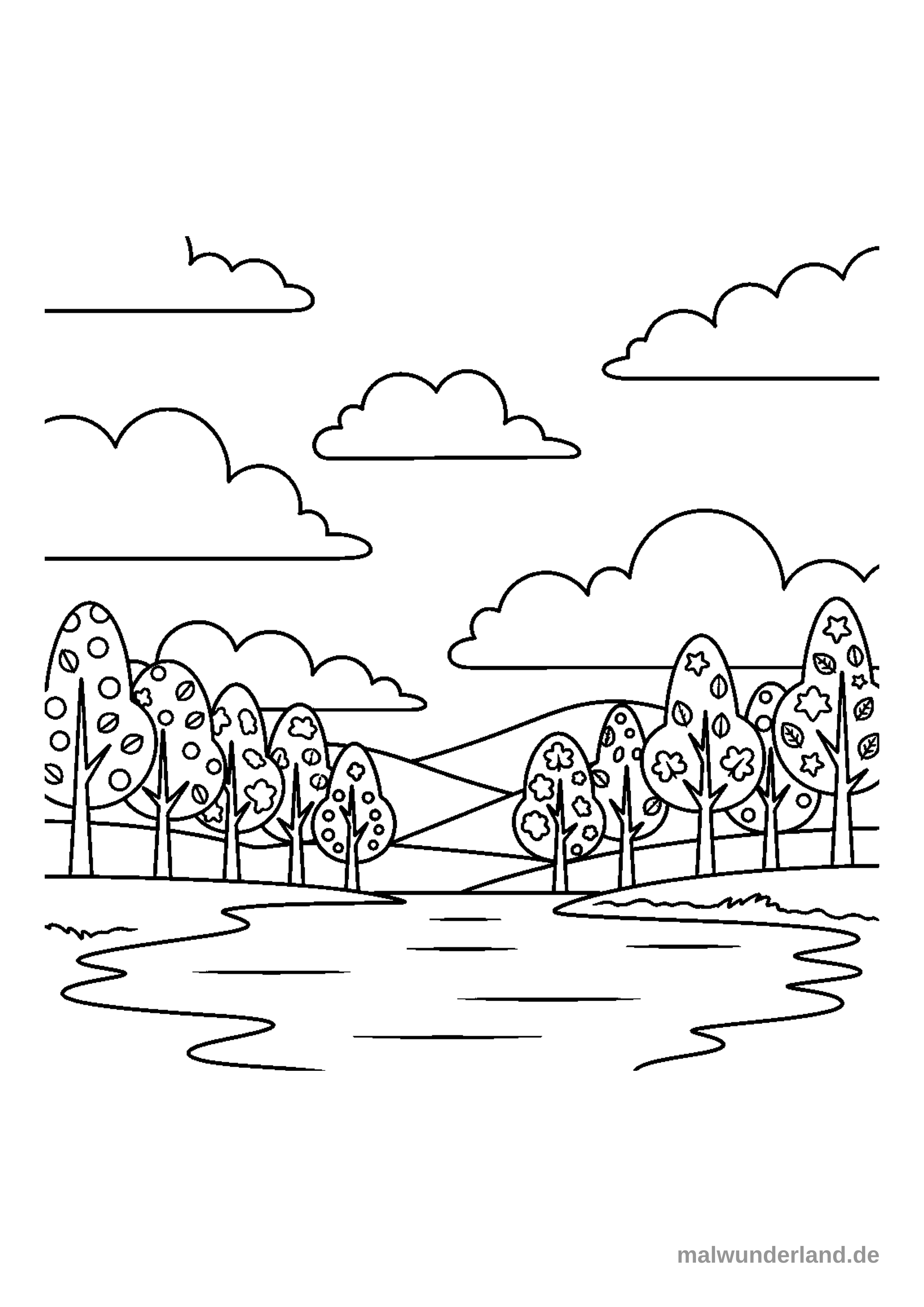Das Ausmalbild zeigt eine friedliche Herbstlandschaft mit einem großen See im Vordergrund, der von Bäumen und sanften Hügeln umgeben ist. Am Himmel schweben mehrere Wolken über der Szenerie.