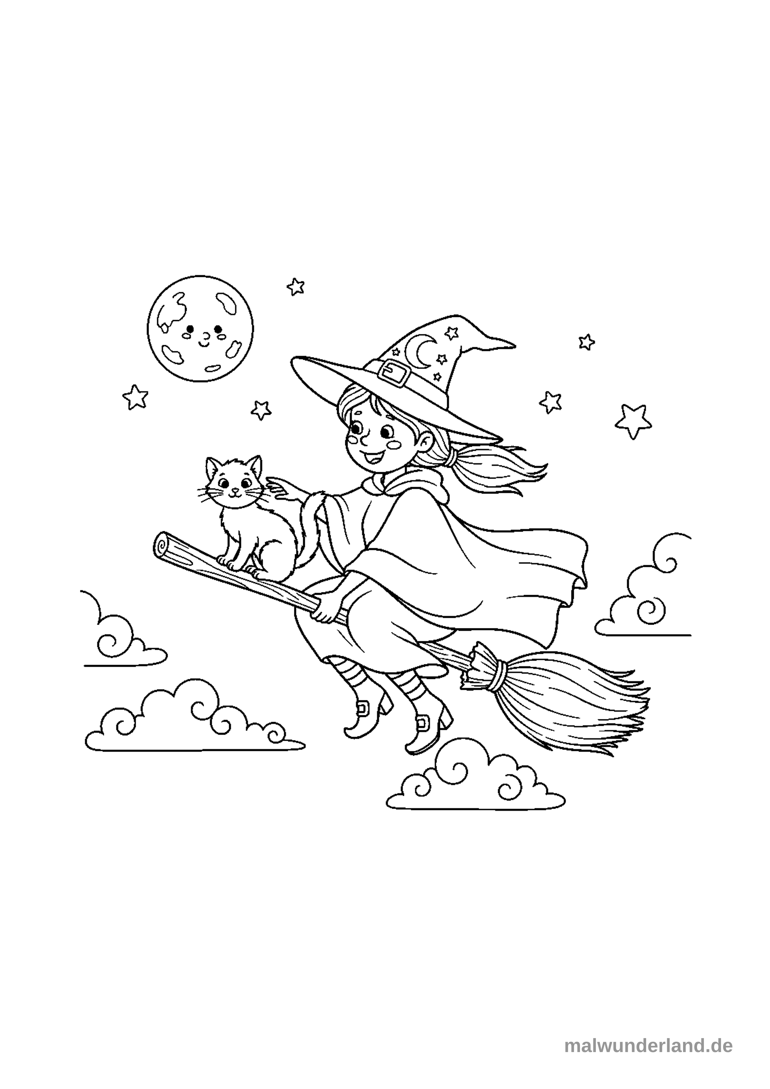 Das Ausmalbild zeigt eine lächelnde junge Hexe mit Hut, die auf einem Besen durch die Luft fliegt. Vor ihr sitzt ein kleiner Kater auf dem Besen, während ein freundlich blickender Mond und mehrere Sterne am Nachthimmel zu sehen sind, umgeben von lockeren Wolken.