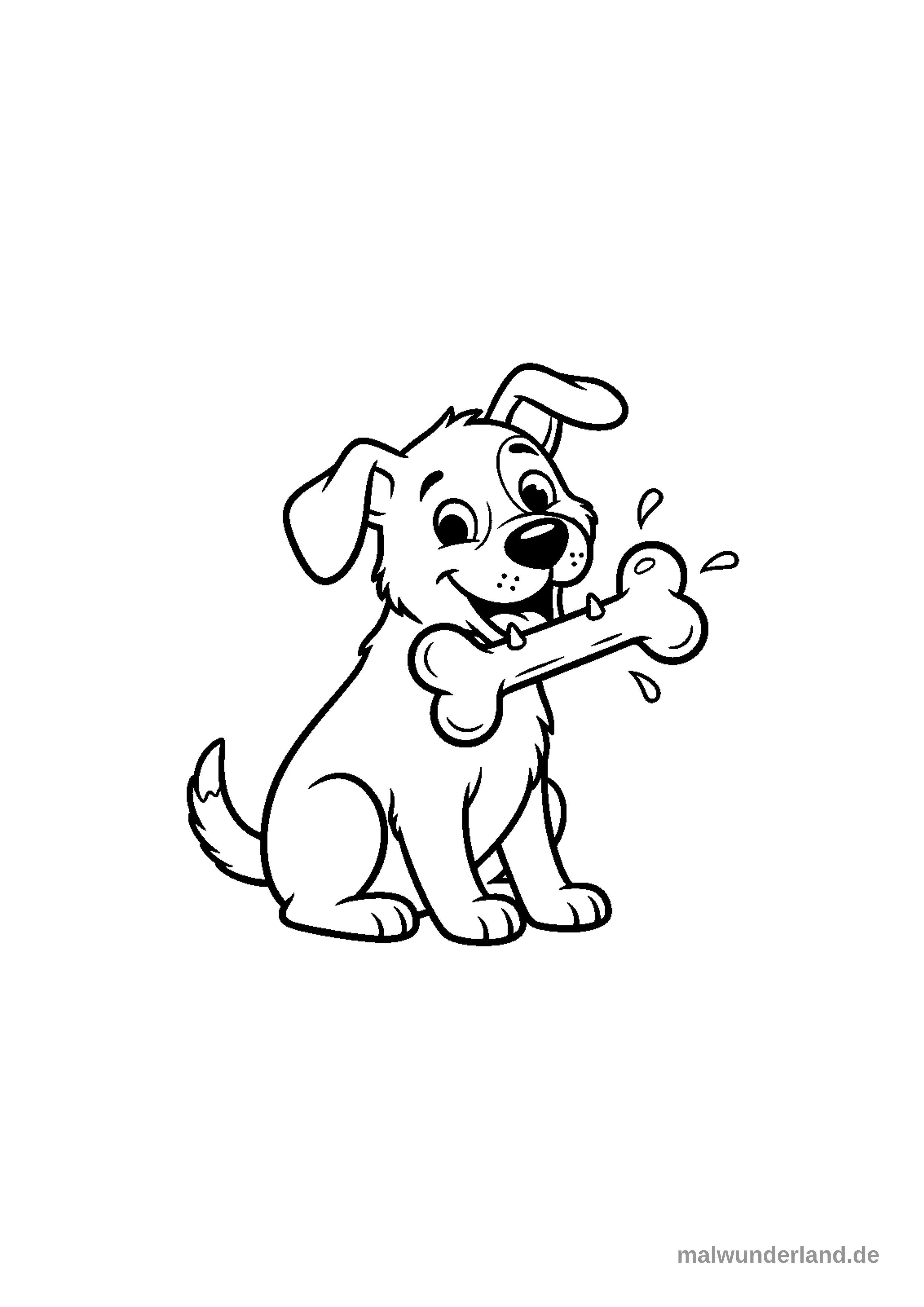 Ein fröhlicher Cartoon-Hund sitzt und hält einen großen Knochen im Maul. Um den Knochen herum sind Tropfen zu sehen, was darauf hindeutet, dass er sein Leckerli genießt.