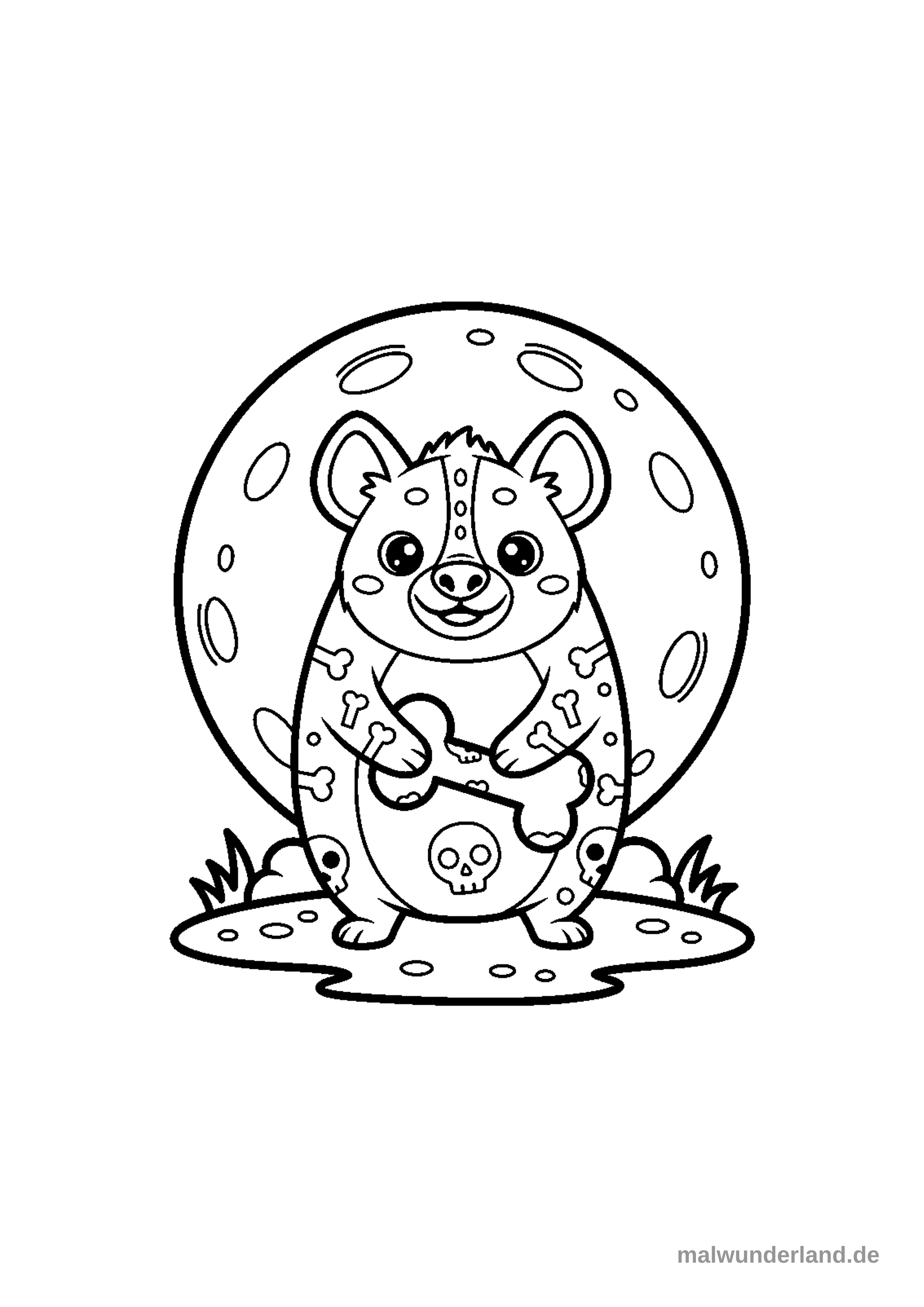 Eine Hyäne, die im Mondlicht steht und lacht. Ihr Fell ist mit Knochenmotiven und Totenkopfmustern verziert.