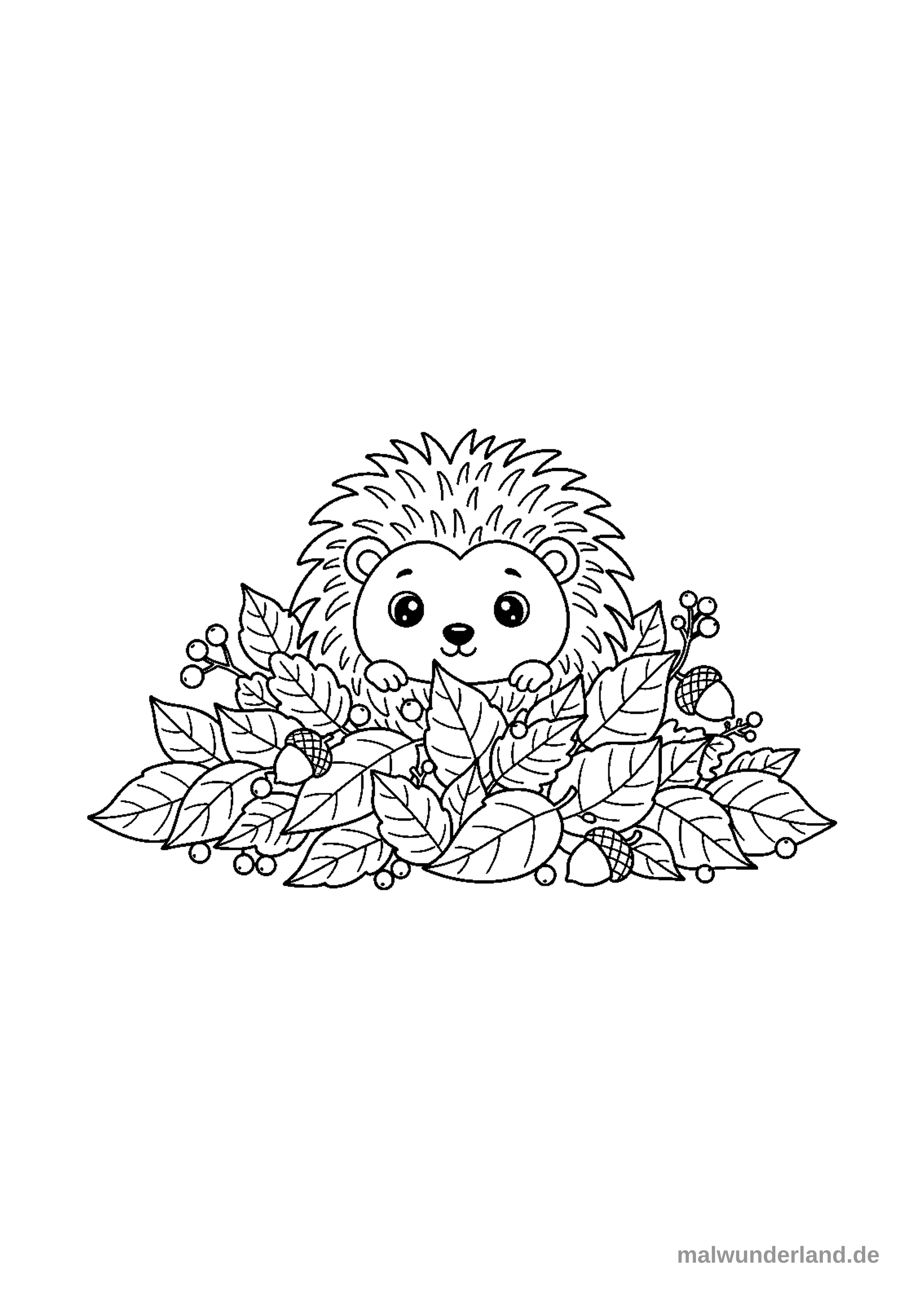 Ein niedlicher Igel schaut aus einem großen Haufen von Herbstblättern, Beeren und Eicheln hervor. Man sieht den Kopf und die kleinen Pfoten des Igels, der zwischen den Blättern hervorlugt.