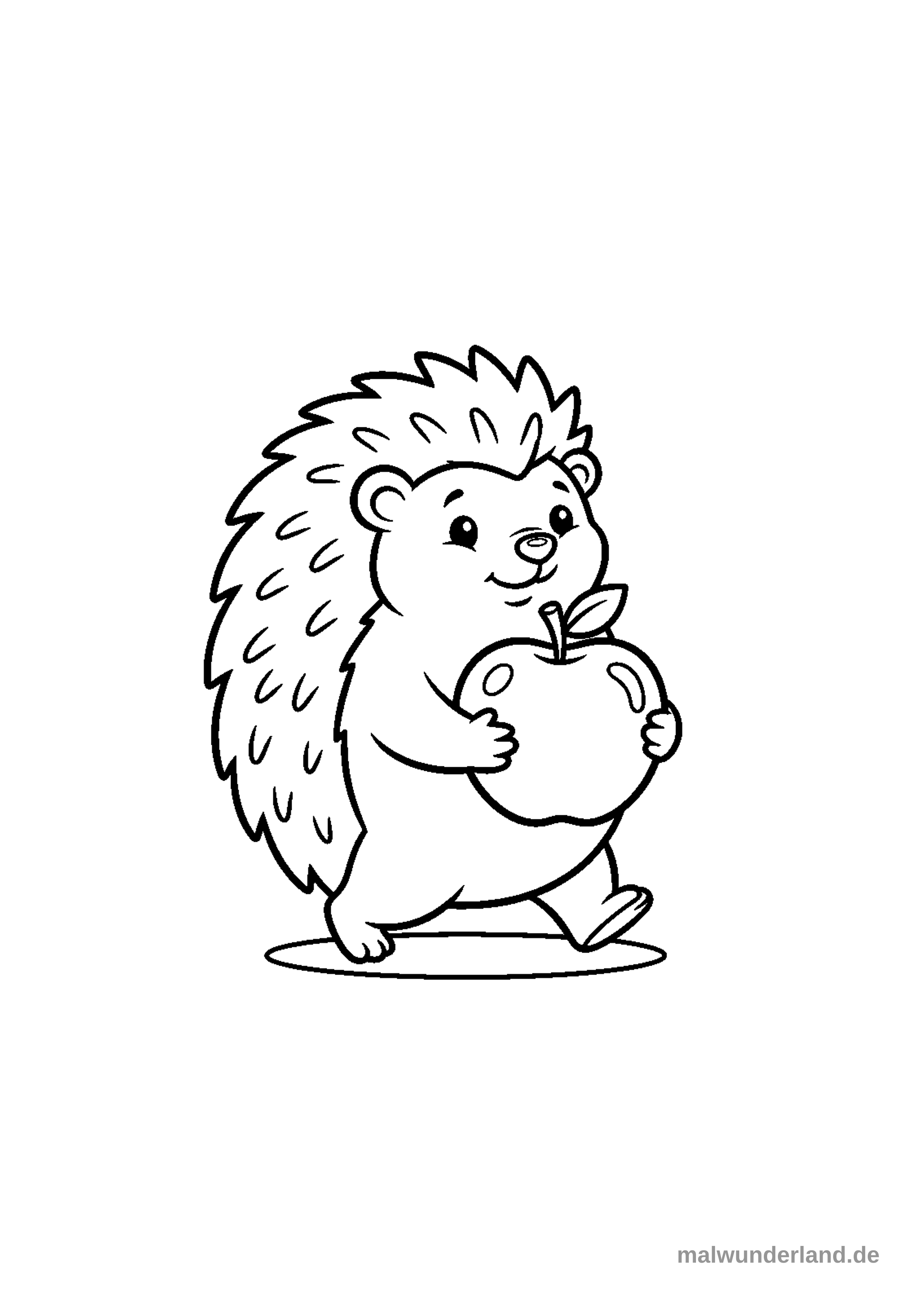 Das Ausmalbild zeigt einen niedlichen Igel, der einen großen Apfel in seinen Pfoten hält. Der Igel geht geradeaus und lächelt freundlich mit einem glücklichen Ausdruck.