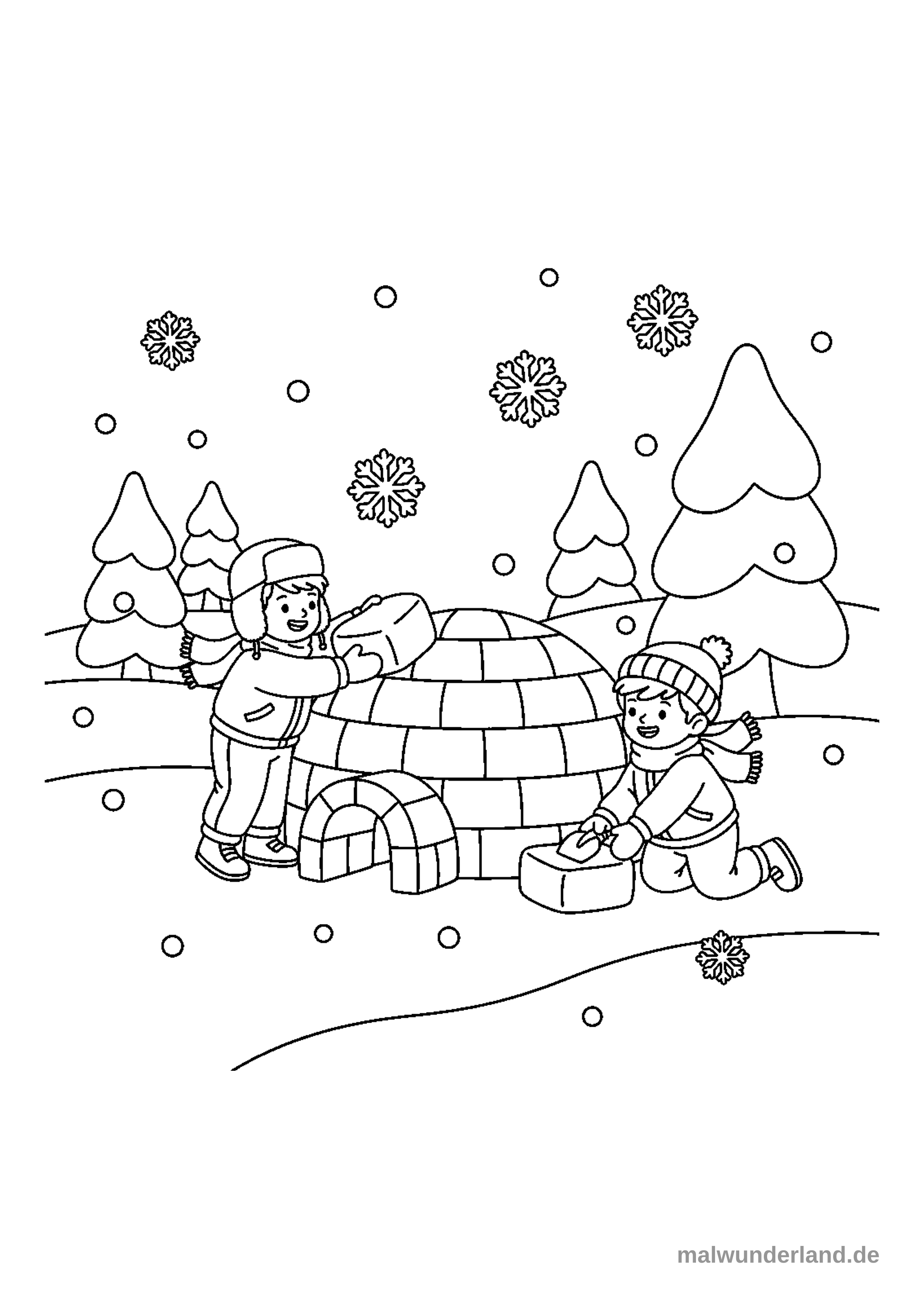 Das Ausmalbild zeigt zwei Kinder, die in einer verschneiten Winterlandschaft ein Iglu bauen. Schneeflocken fallen vom Himmel, und im Hintergrund sind schneebedeckte Tannenbäume zu sehen.