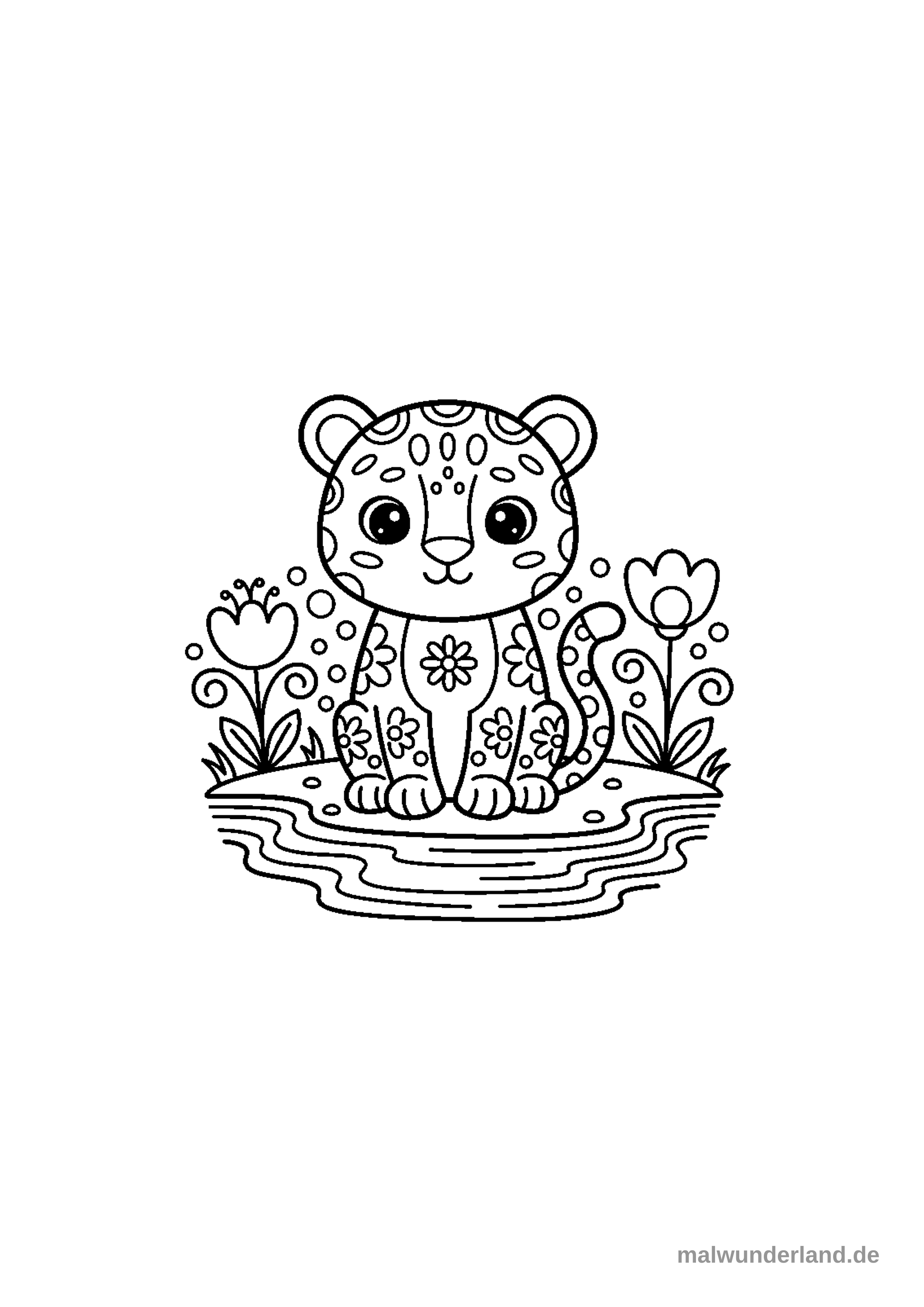 Ein Jaguar, der am Ufer eines Flusses sitzt und auf Beute lauert. Das Fell des Jaguars ist mit floralen und geometrischen Mustern gefüllt, die sich im Wasser spiegeln.