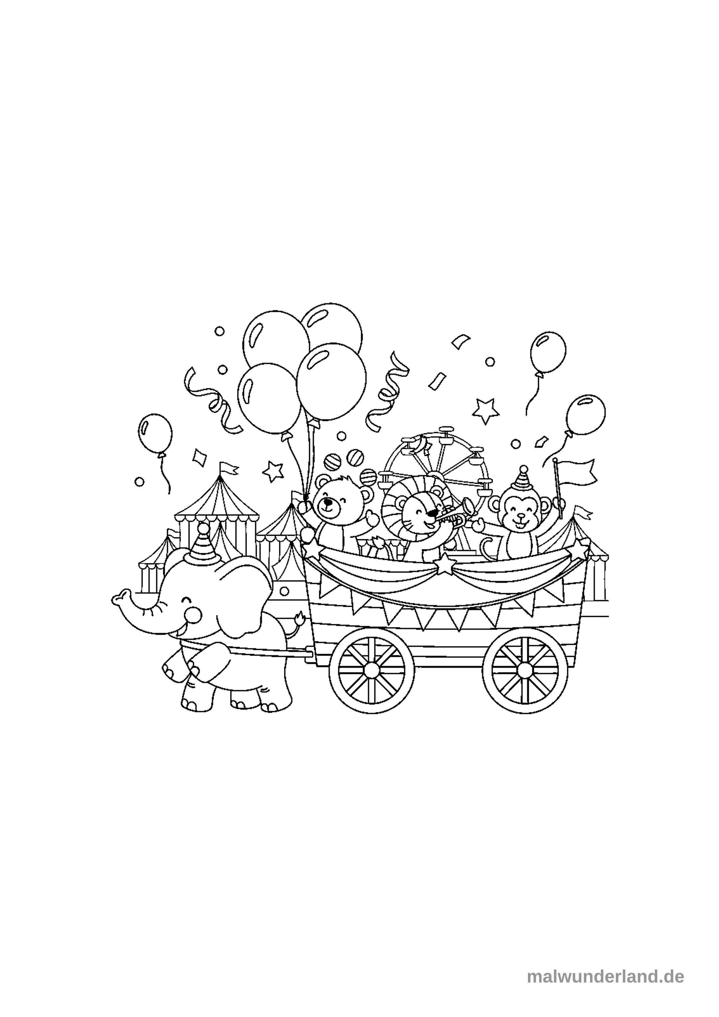 Ein Ausmalbild zeigt einen festlich geschmückten Karnevalswagen, der von einem lächelnden Elefanten mit Partyhut gezogen wird. Im Wagen sitzen ein Bär, ein Löwe und ein Affe, ebenfalls mit Partyhüten, umgeben von schwebenden Luftballons, Konfetti und Zirkuszelten mit einem Riesenrad im Hintergrund.