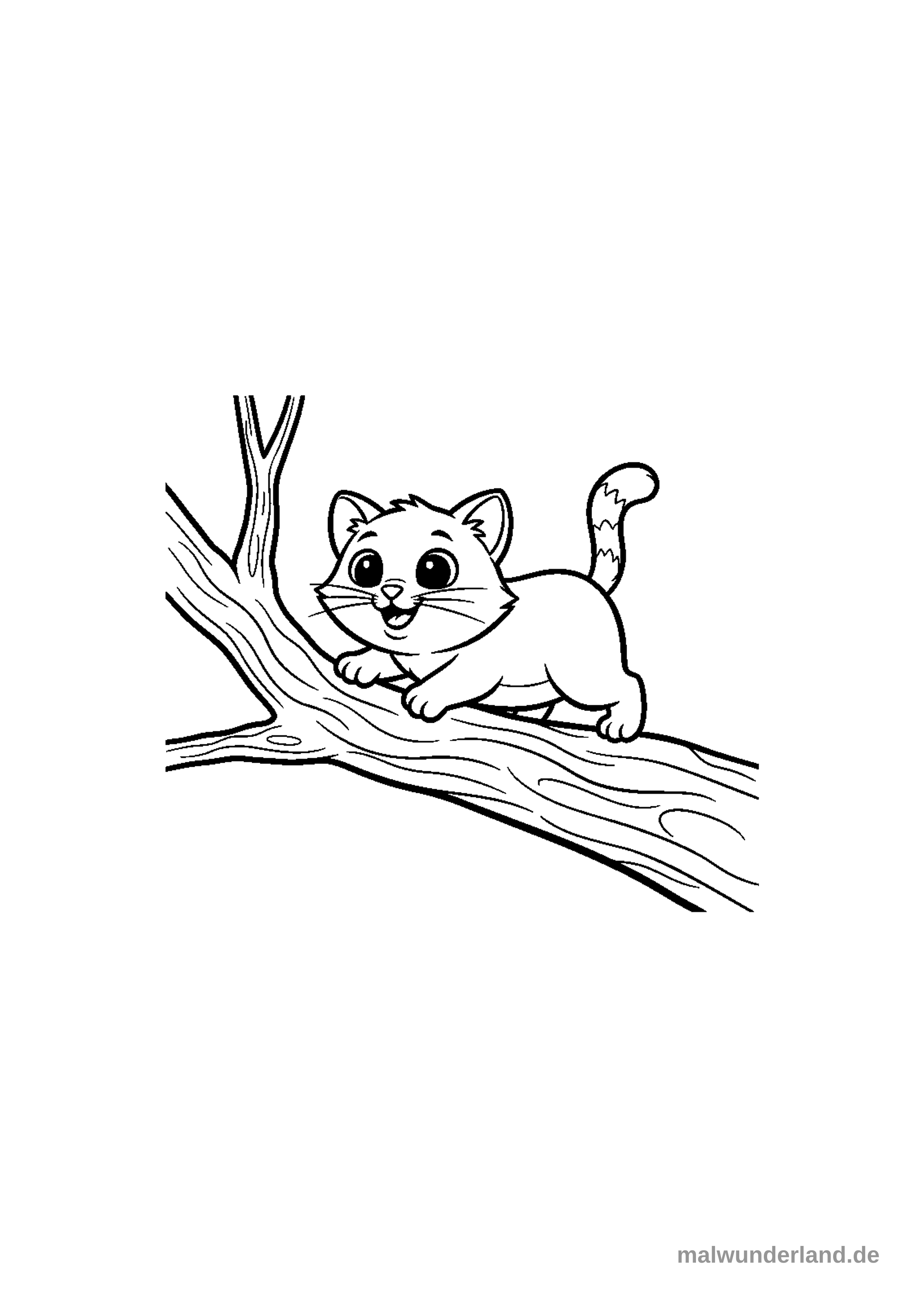 Schau mal, diese kleine Katze ist auf Entdeckungstour! Sie klettert mutig auf einem Baumast entlang und schaut neugierig in die Welt. Ihre Augen leuchten vor Freude und sie kann es kaum erwarten, weiterzuspielen.