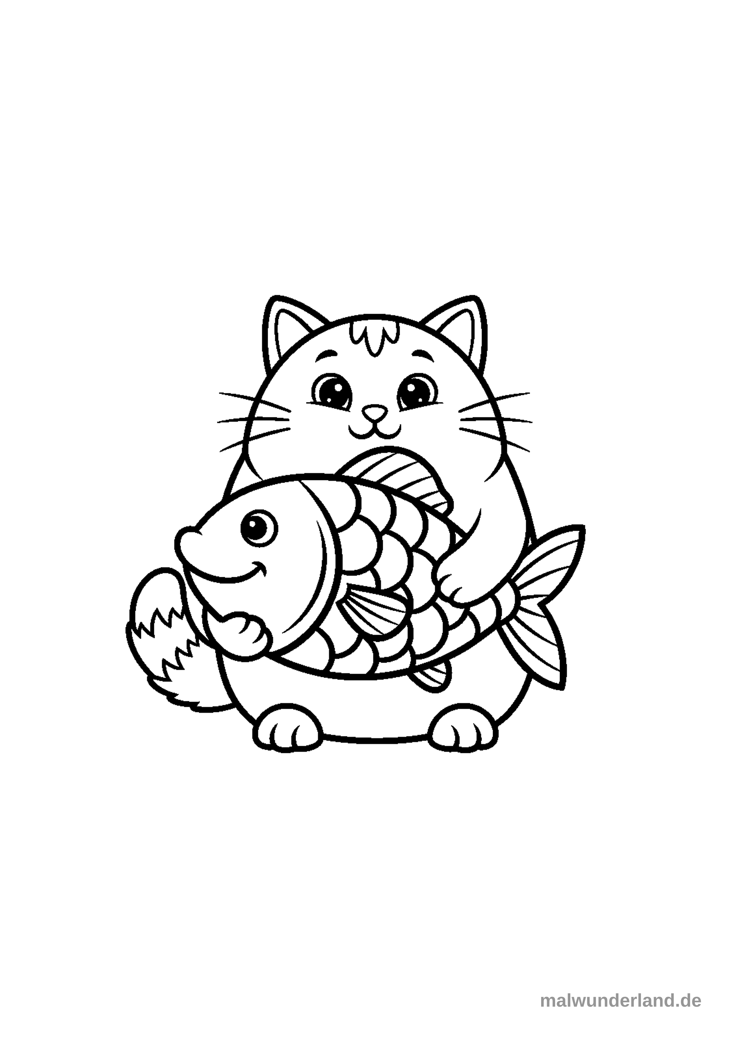 Das Ausmalbild zeigt einen niedlichen Cartoon-Kater, der mit seinen Pfoten einen großen, lächelnden Fisch hält. Der Kater hat große Augen, Schnurrhaare und einen freundlichen Ausdruck.