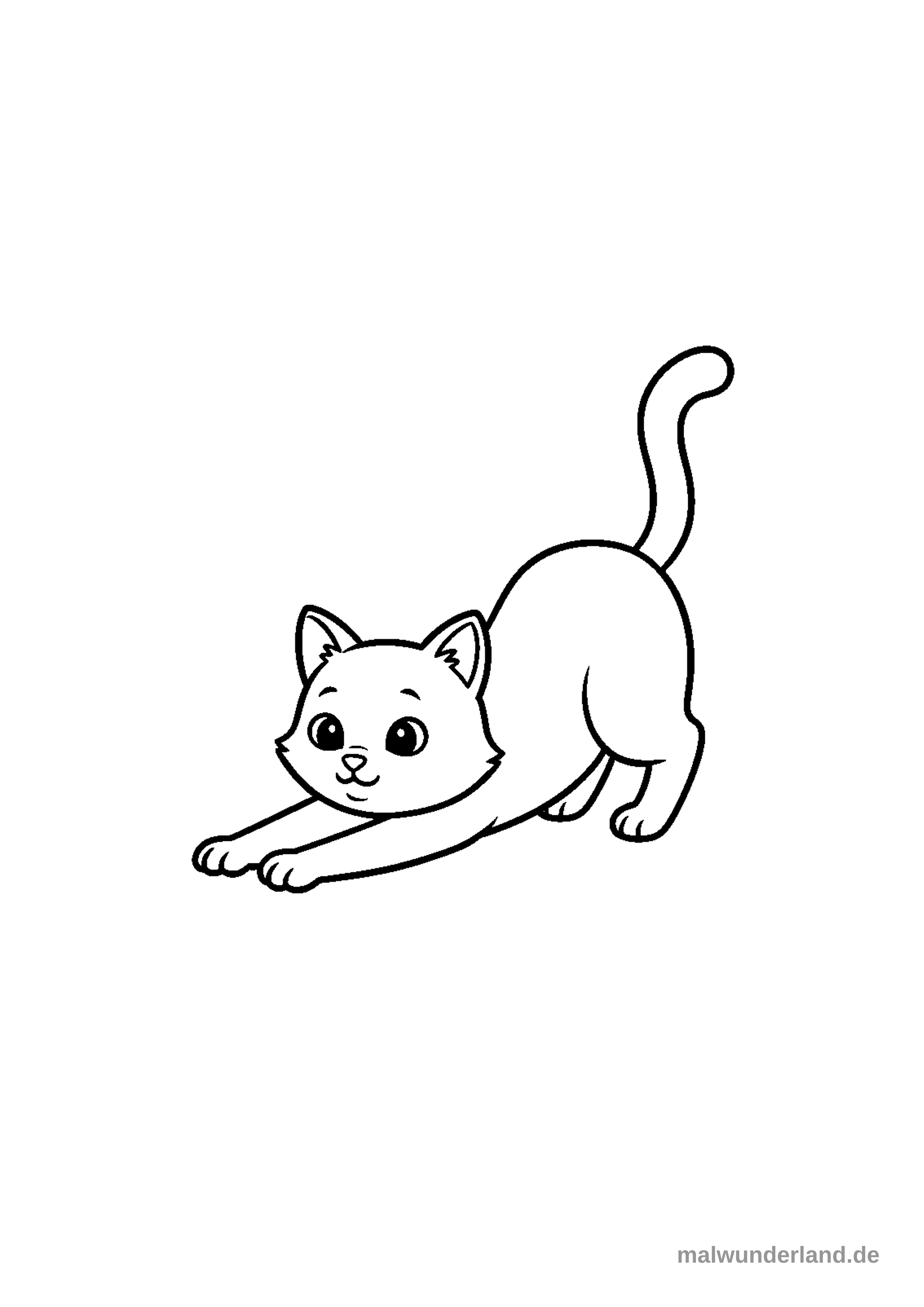 Das Bild zeigt eine niedliche Katze als Schwarz-Weiß-Umrisszeichnung, die sich genüsslich streckt. Die Katze hat ihre Vorderpfoten nach vorne ausgestreckt und ihren Rücken gewölbt, während ihr Schwanz nach oben gekrümmt ist.