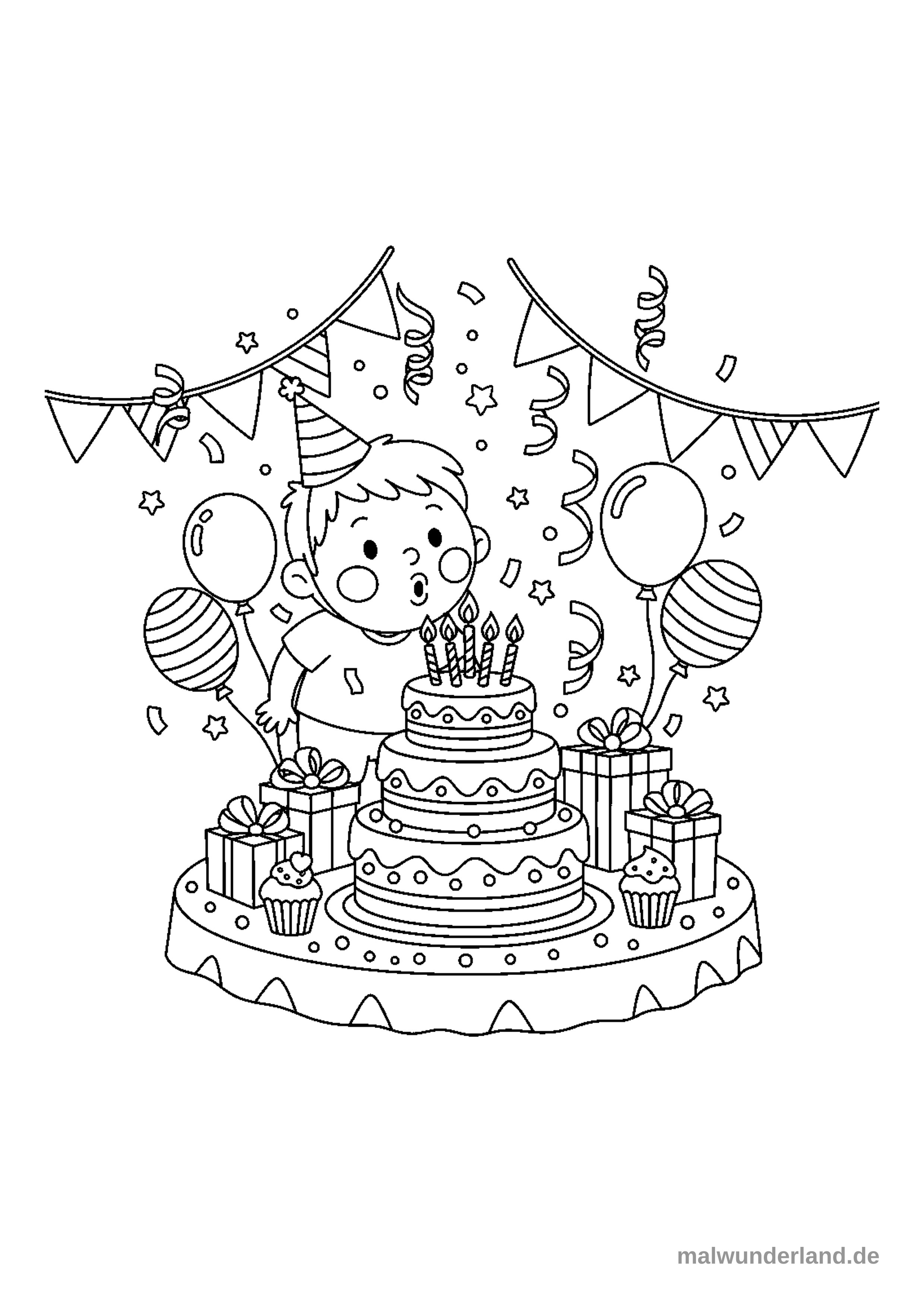 Ein Junge mit Partyhut pustet die fünf brennenden Kerzen auf einem großen dreistöckigen Geburtstagskuchen aus. Der Tisch ist mit Geschenken und Cupcakes gedeckt, während im Hintergrund Luftballons, Girlanden, Konfetti und Sterne die festliche Szene schmücken.
