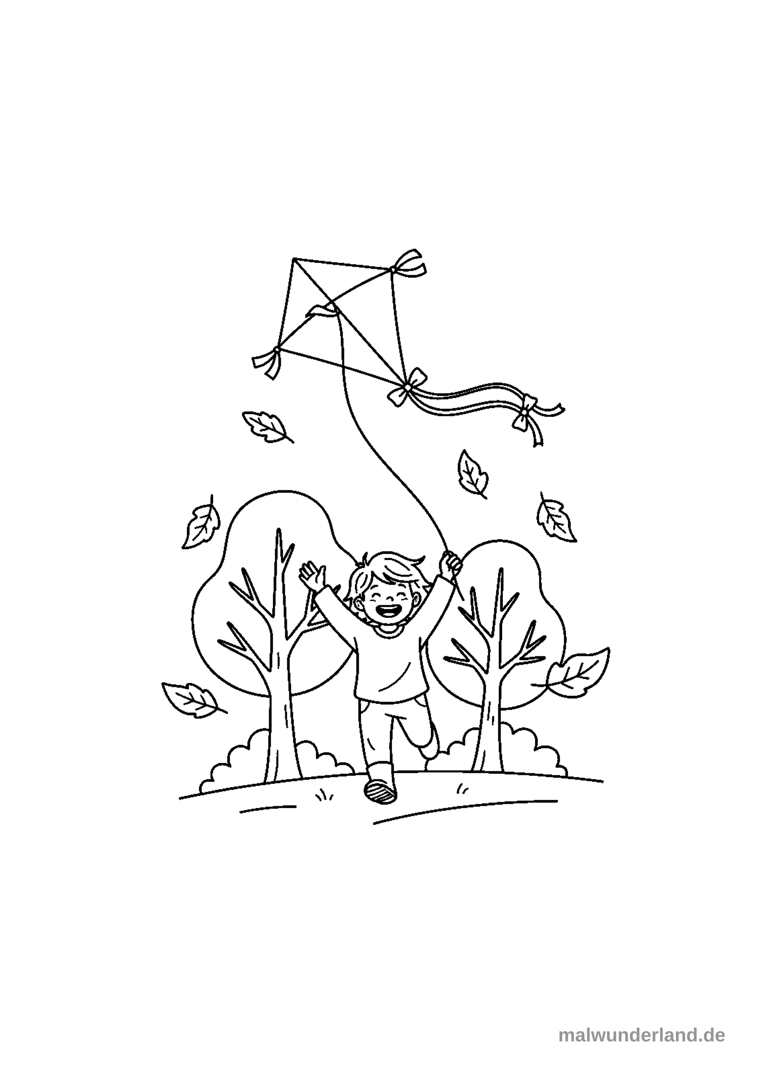 Das Ausmalbild zeigt ein fröhliches Kind, das rennt und die Schnur eines hoch am Himmel fliegenden Drachens hält. Um das Kind herum sind Bäume, Büsche und fallende Blätter zu sehen, was eine herbstliche Szene darstellt.