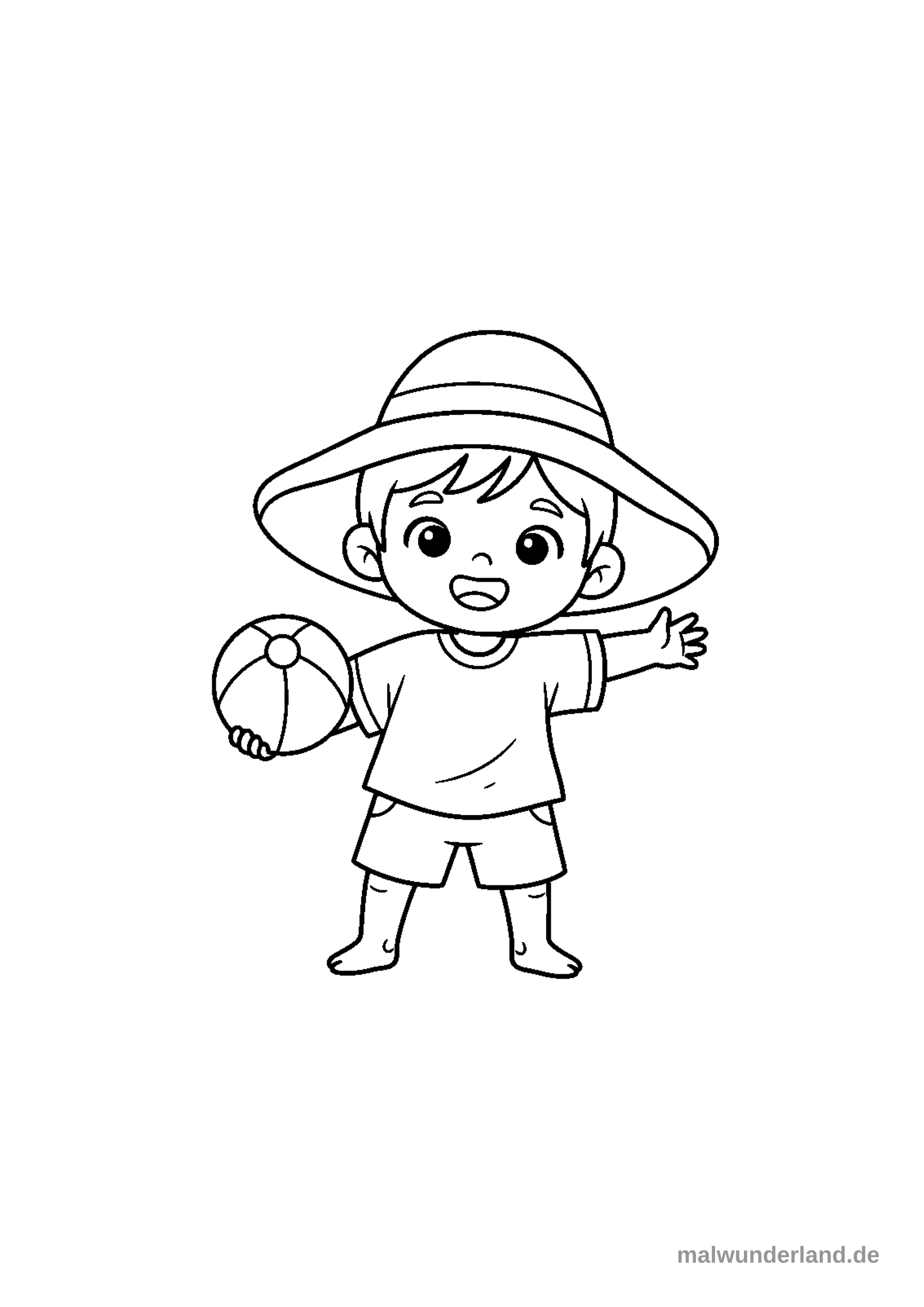 Das Ausmalbild zeigt ein lächelndes Kind mit einem breiten Sonnenhut, das eine Hand winkend ausstreckt und in der anderen Hand einen Beachball hält. Das Kind trägt ein einfaches T-Shirt und Shorts und steht barfuß.